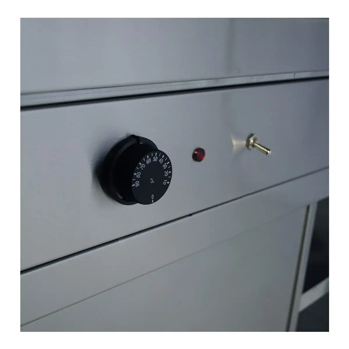 Κατασκευασμένο από ανοξείδωτο χάλυβα Πόδια ρυθμιζόμενα ανοξείδωτα Ενδεικτική λυχνία λειτουργίας Θερμοστάτης αντίστασης Βάνα εξόδου νερού Συρόμενες πόρτες Αντίσταση νερού