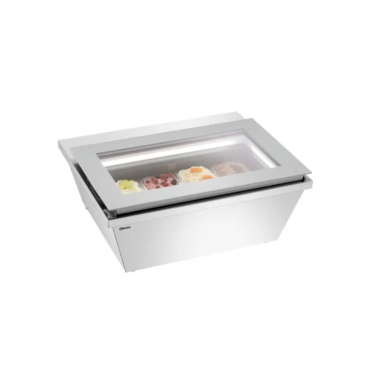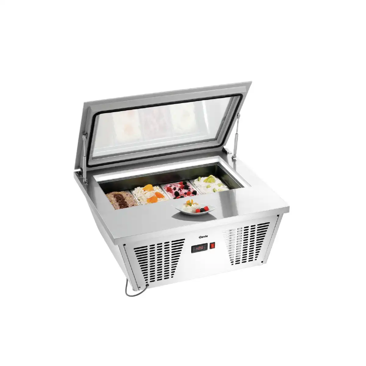 Επιτραπέζια βιτρίνα σερβιρίσματος παγωτού , χωρητικότητας 26 lt, Bartscher Γερμανίας. Για μεμονωμένες σπεσιαλιτέ παγωτού – Με τα 4 αφαιρούμενα δοχεία παγωτού, η βιτρίνα παγωτού αποτελεί τη λύση μικρών διαστάσεων για την προετοιμασία του επιδόρπιου σε όλες τις κουζίνες γαστρονομίας. Το επίπεδο γυάλινο καπάκι με φωτισμό LED προσφέρει γρήγορη επισκόπηση όλων των παγωμένων λιχουδιών. Χάρη στους ελέγχους στάθμης πλήρωσης αποφεύγονται έτσι οι απώλειες θερμοκρασίας. Δεν ενδείκνυται για λύση μόνιμης αποθήκευσης του παγωτού.