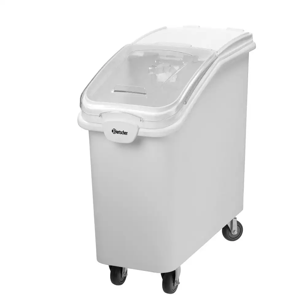 Τροχήλατο δοχείο αποθήκευσης (foodsafe) , χωρητικότητας 81 lt , 500381 Bartscher Γερμανίας. Φορητό, ανθεκτικό δοχείο αποθήκευσης για υγιεινό εφοδιασμό διάφορων ειδών δημητριακών, καθώς και μπαχαρικών, ρυζιού ή ζυμαρικών. Το διάφανο καπάκι επιτρέπει γρήγορη επισκόπηση του ξηρού προϊόντος που βρίσκεται στο δοχείο.