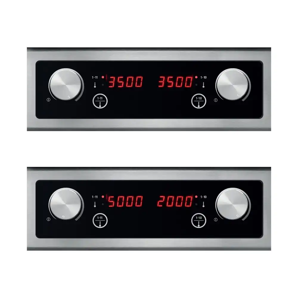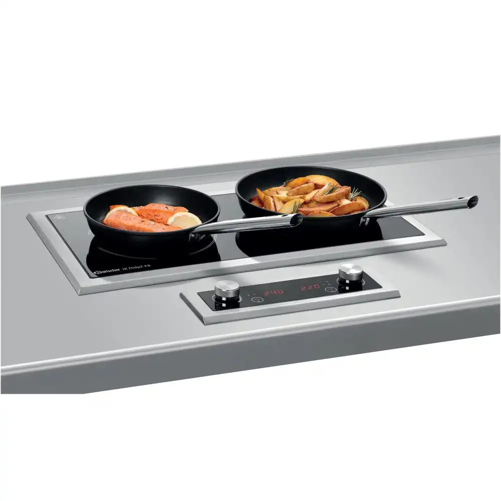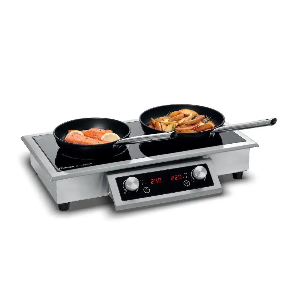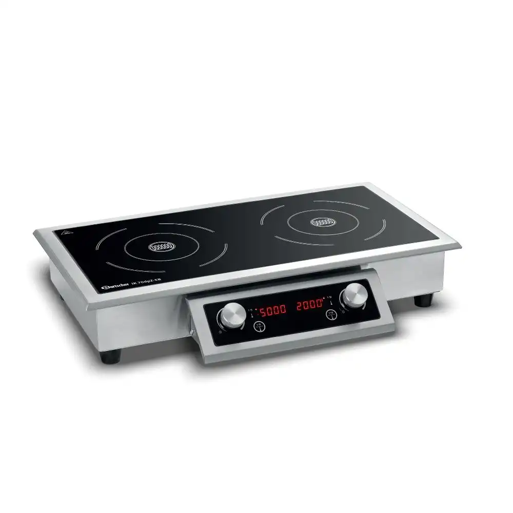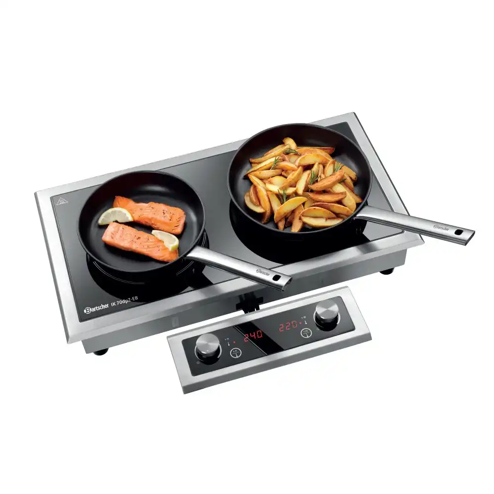 Επαγωγική (induction) αναλογική εστία IK 70dpZ-EB με δυνατότητα εντοίχισης , Bartscher Γερμανίας. Η επαγωγική εστία με αφαιρούμενο χειριστήριο ελέγχου είναι κατάλληλη τόσο ως επιτραπέζια επισκευή όσο και για την τοποθέτηση στον μπουφέ. Τα 7000 Watt μπορούν να διανεμηθούν ανάλογα με τις ανάγκες σας στις δύο εστίες – για γρήγορο μαγείρεμα ή τσιγάρισμα, η αριστερή εστία φτάνει τα έως 5000 Watt.