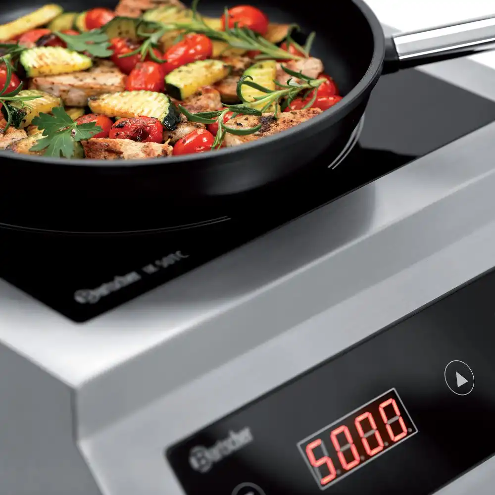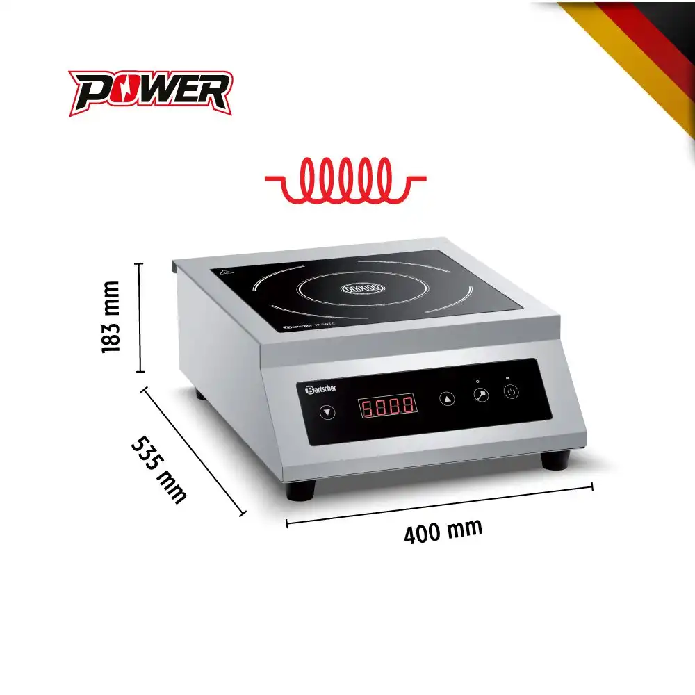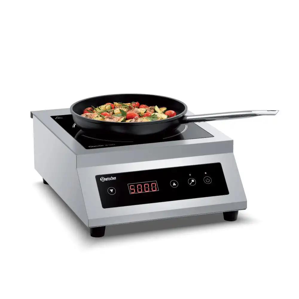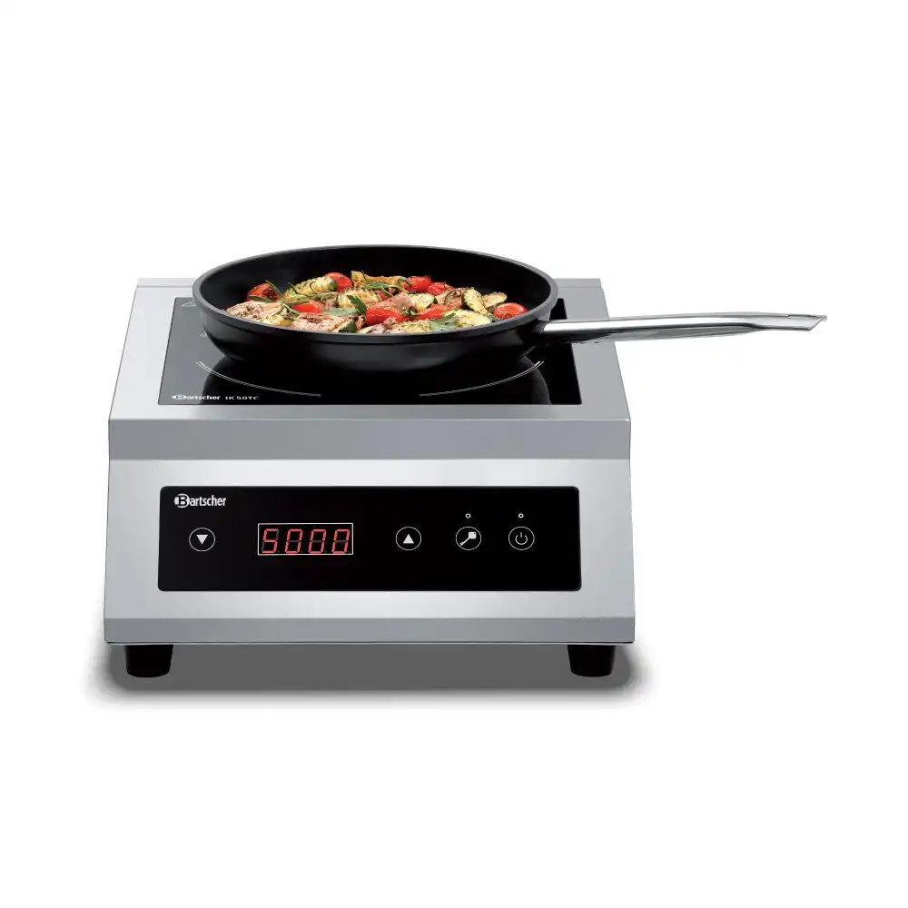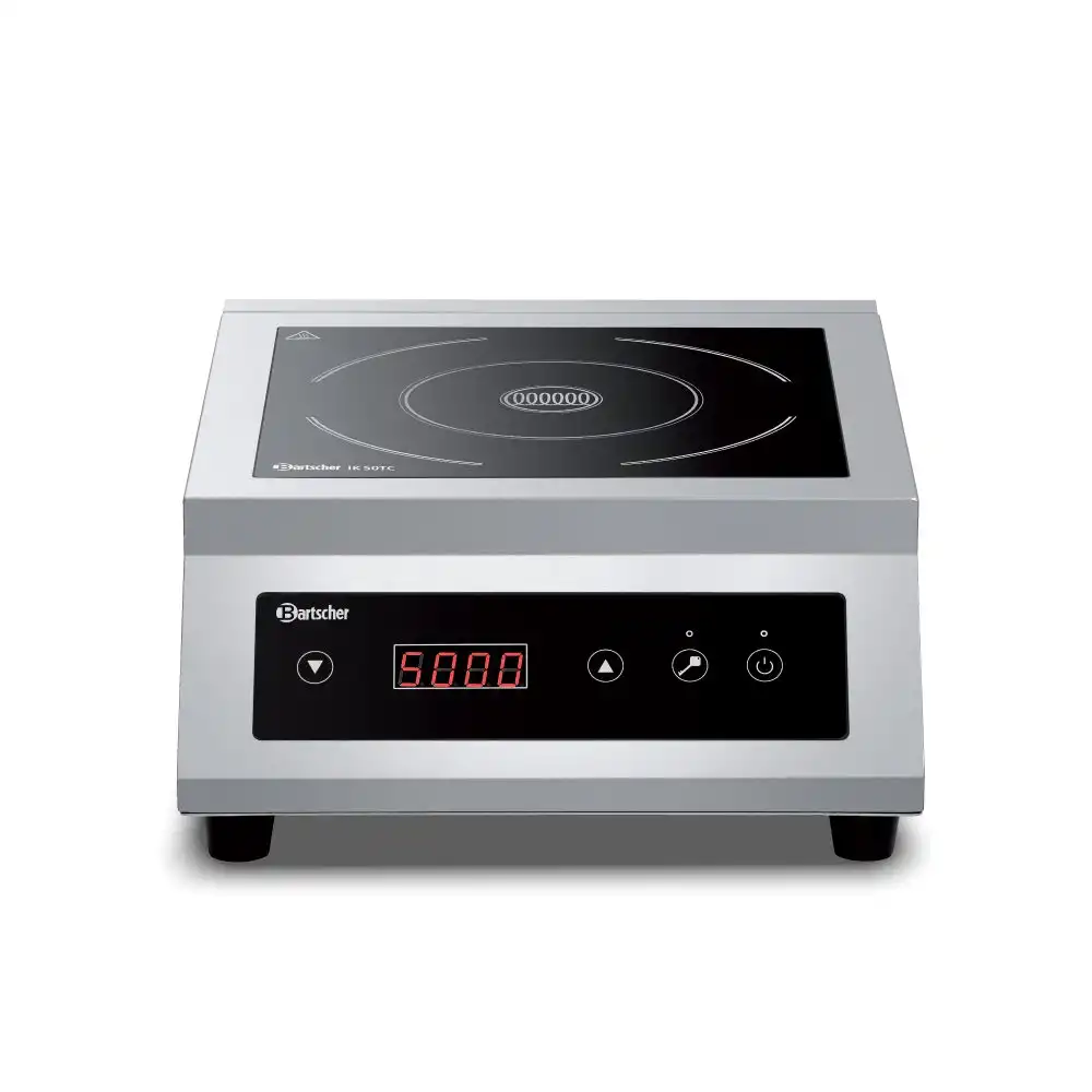 Επαγωγική (induction) ηλεκτρονική εστία ΙΚ 50 TC , Bartscher Γερμανίας. Με τα 5 kW, η επαγωγική εστία εξασφαλίζει μεγάλη απόδοση στη φορητή εστία. Η ρύθμιση της απόδοσης πραγματοποιείται εύκολα μέσω χειρισμού αφής.