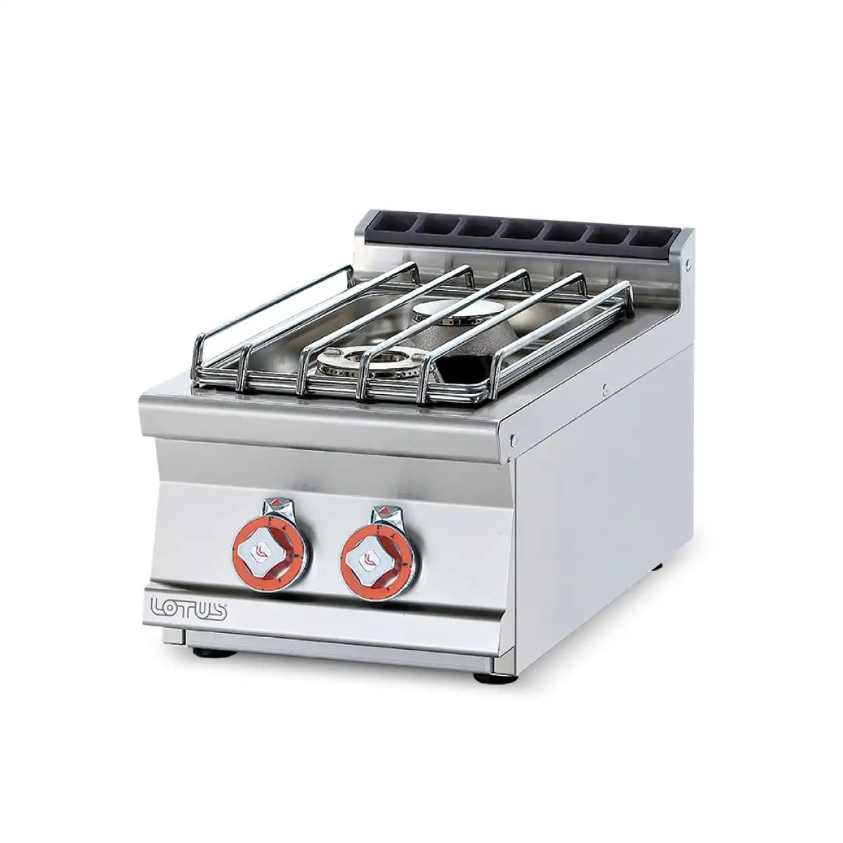 Επιτραπέζια διπλή εστία αερίου , του εργοστασίου Lotus. Κατασκευασμένο με χρήση ανοξείδωτου χάλυβα ποιότητας (CrNi 18/10 AISI 304) , με διακόπτες αδιάβροχης ποιότητας (IPX5).