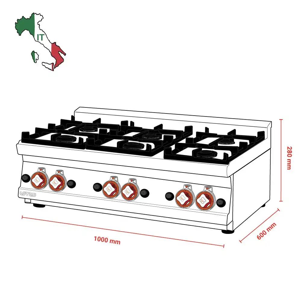 Επιτραπέζια εξαπλή εστία αερίου , του εργοστασίου Lotus. Κατασκευασμένο με χρήση ανοξείδωτου χάλυβα ποιότητας (CrNi 18/10 AISI 304) , με διακόπτες αδιάβροχης ποιότητας (IPX5).