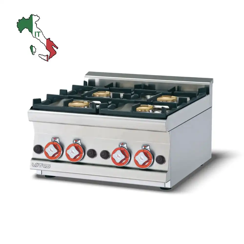 Επιτραπέζια τετραπλή εστία αερίου , του εργοστασίου Lotus. Κατασκευασμένο με χρήση ανοξείδωτου χάλυβα ποιότητας (CrNi 18/10 AISI 304) , με διακόπτες αδιάβροχης ποιότητας (IPX5).