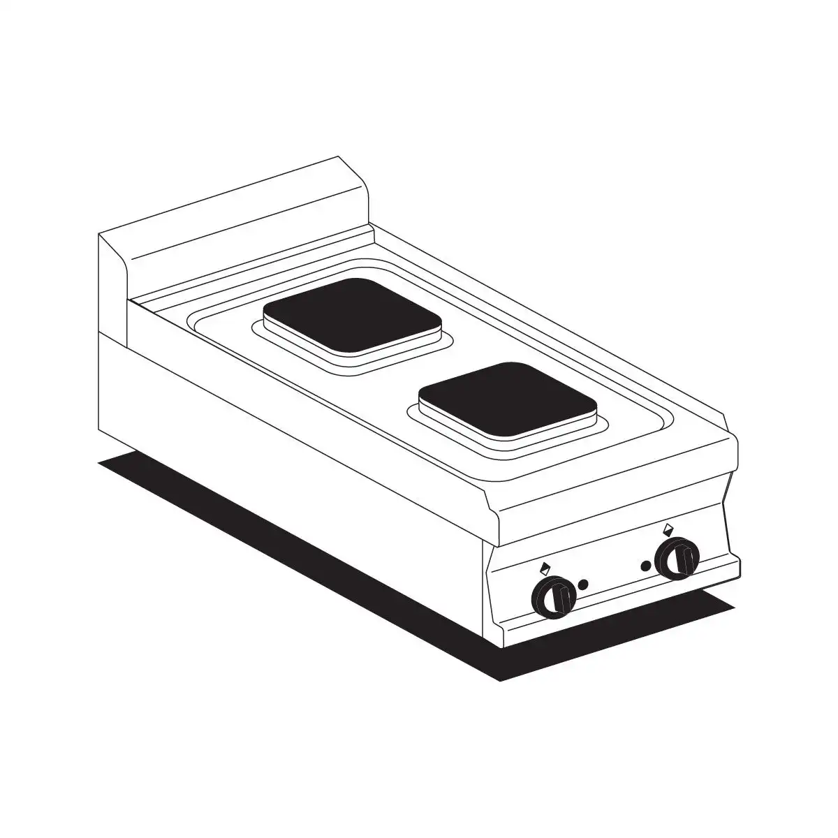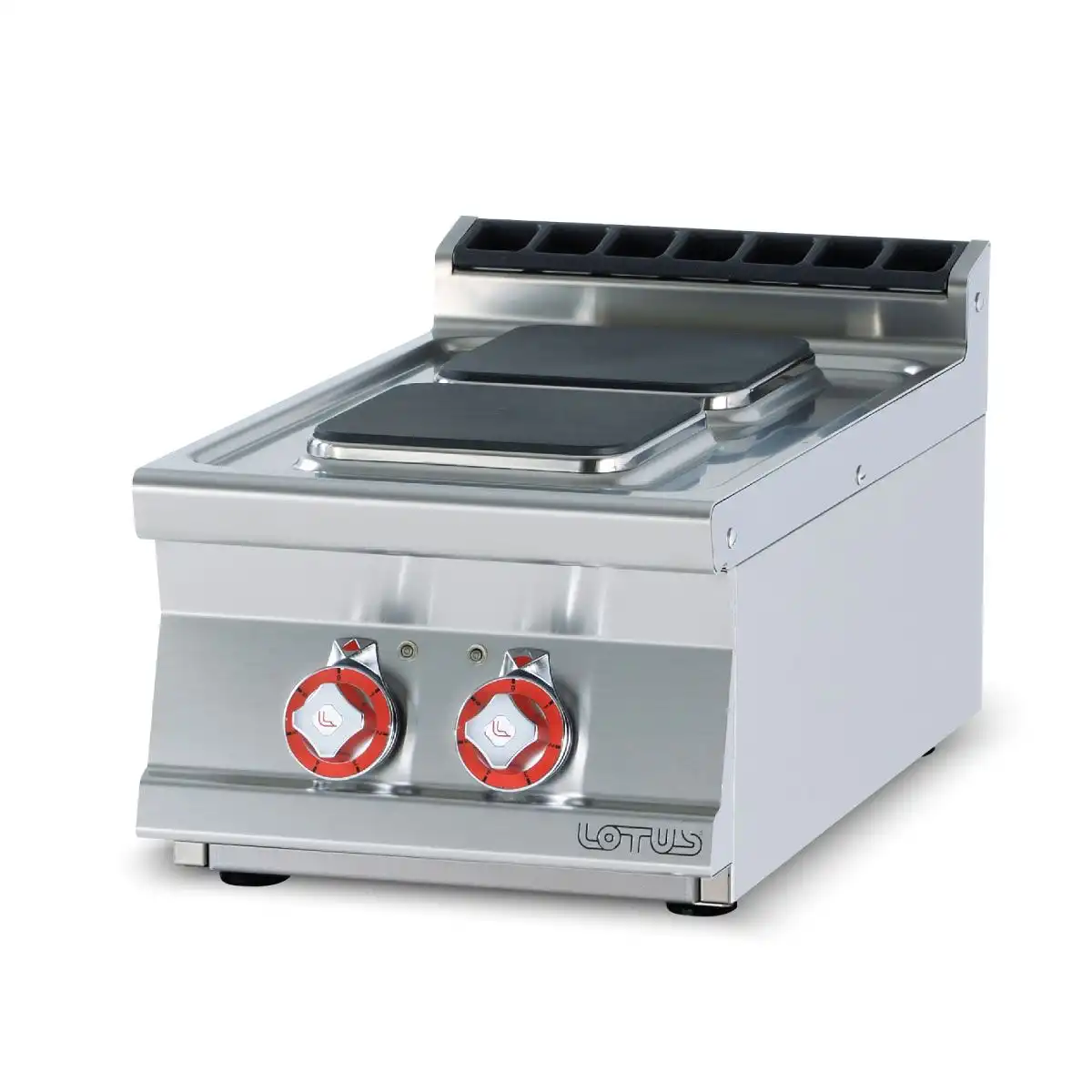 Ηλεκτρική επιτραπέζια εστία διπλή, του εργοστασίου Lotus Ιταλίας. Κατασκευασμένο με χρήση ανοξείδωτου χάλυβα ποιότητας (CrNi 18/10 AISI 304) , με διακόπτες αδιάβροχης ποιότητας (IPX5).