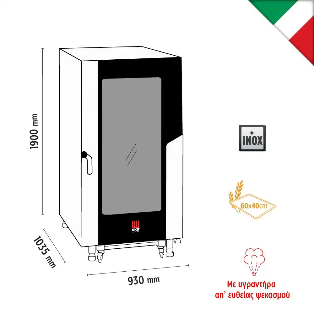 Κυκλοθερμικός φούρνος ηλεκτρικός,16 θέσεων (400x600mm). Με υγραντήρα απ΄ευθείας ψεκασμού, ψηφιακό πίνακα λειτουργιών και ενσωματωμένο πλύσιμο, EKA Italy.