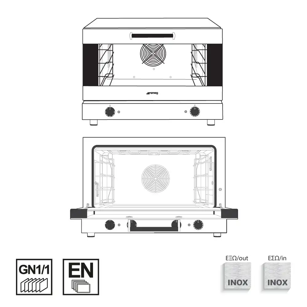 Κυκλοθερμικός φούρνος για αερόθερμο ψήσιμο,χωρητικότητας 4 λαμαρινών (400x600mm) ή (GN 1/1) του εργοστασίου Smeg Ιταλίας. Λειτουργίες: Αερόθερμο ψήσιμο