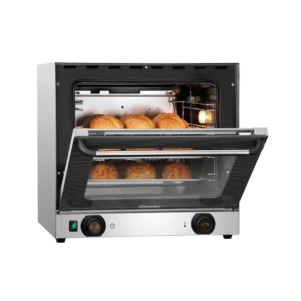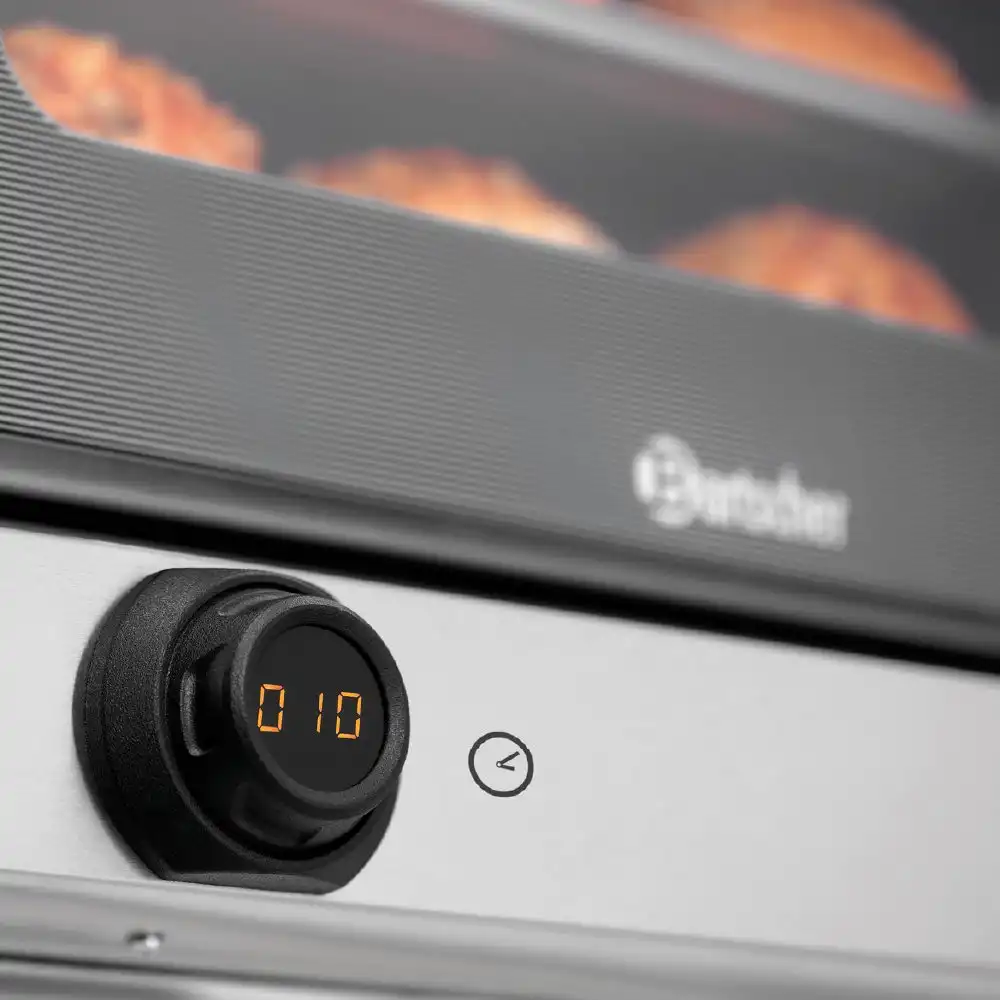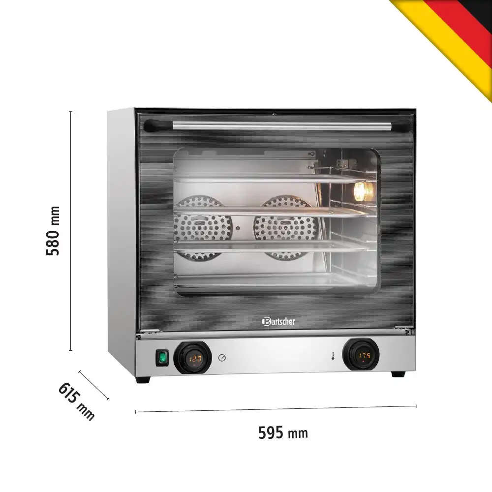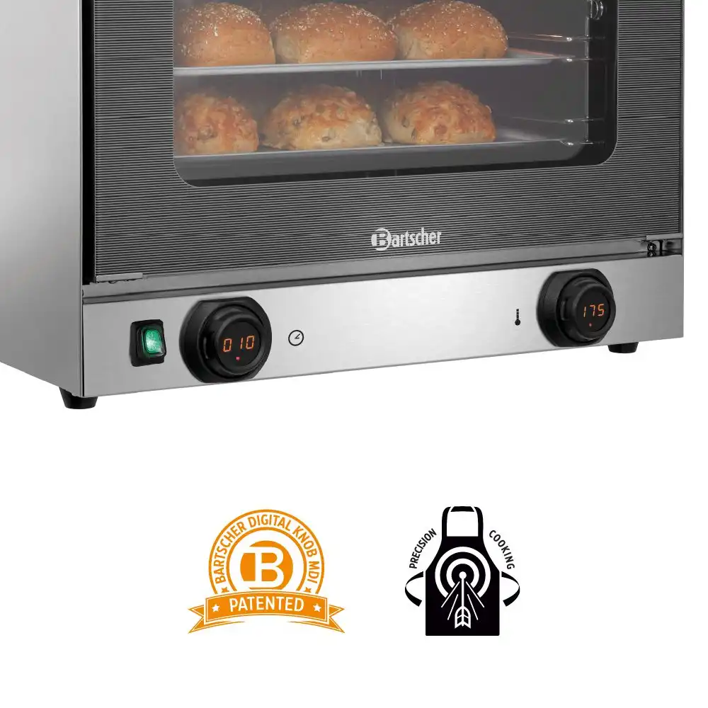 Κυκλοθερμικός φούρνος 4 θέσεων 438x315mm , ΑΤ90-MDI Bartscher Γερμανίας. Μια καλή βάση για επαναλαμβανόμενες διαδικασίες μαγειρέματος – Μέσω των δύο ρυθμιστών με ψηφιακή ένδειξη μπορεί να γίνει ακριβής ρύθμιση της θερμοκρασίας και του χρόνου. Οι 2 κινητήρες διασφαλίζουν καλή κυκλοφορία αέρα και με αυτόν τον τρόπο άριστα αποτελέσματα.