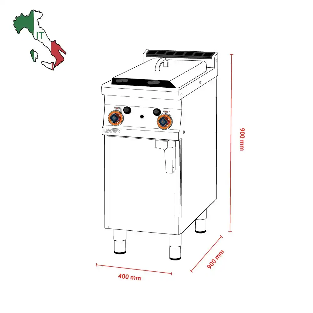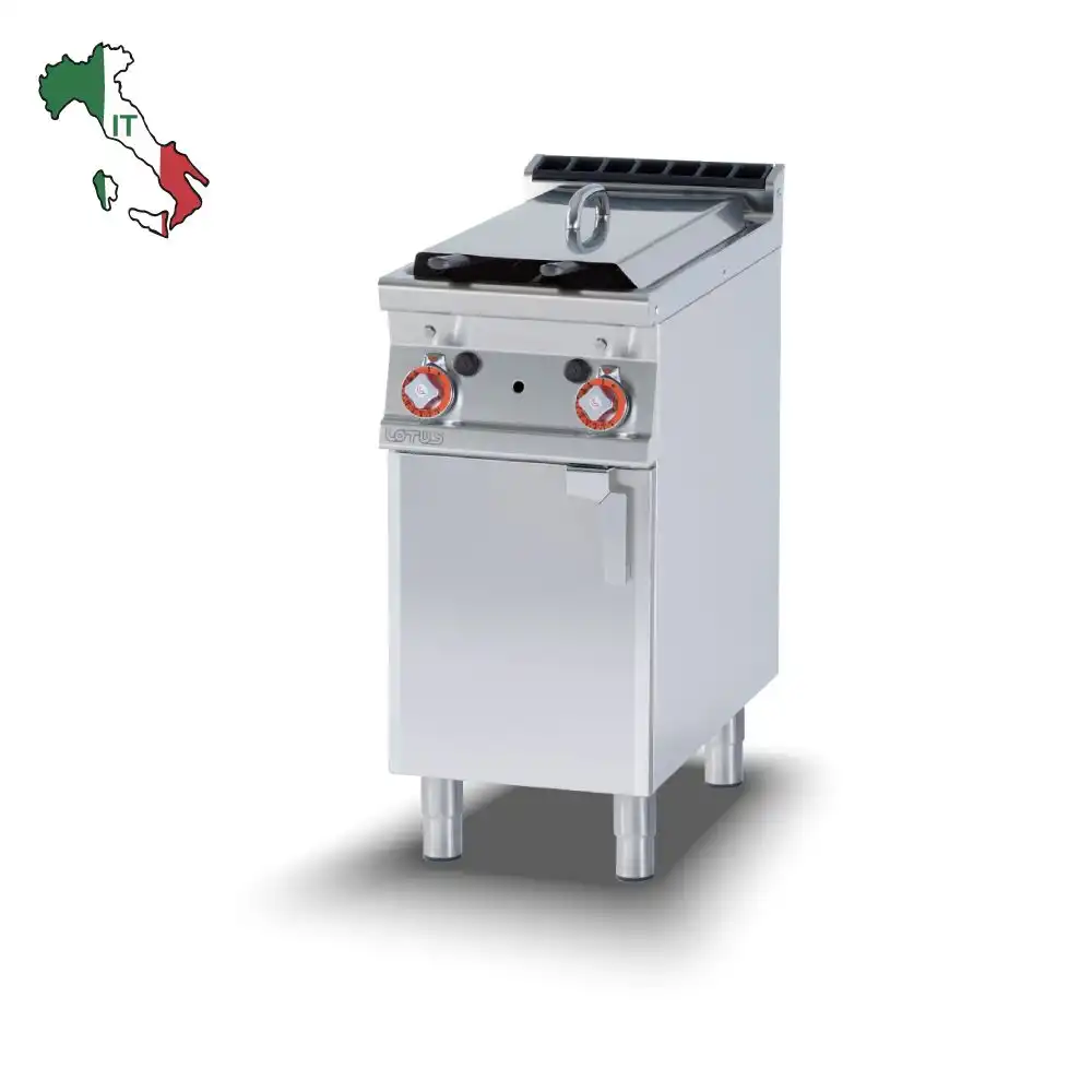 Φριτέζα αερίου επιδαπέδια διπλή, χωρητικότητας 8+8 lt, του εργοστασίου Lotus Ιταλίας.Κατασκευασμένο με χρήση ανοξείδωτου χάλυβα ποιότητας (CrNi 18/10 AISI 304) , με διακόπτες αδιάβροχης ποιότητας (IPX5).