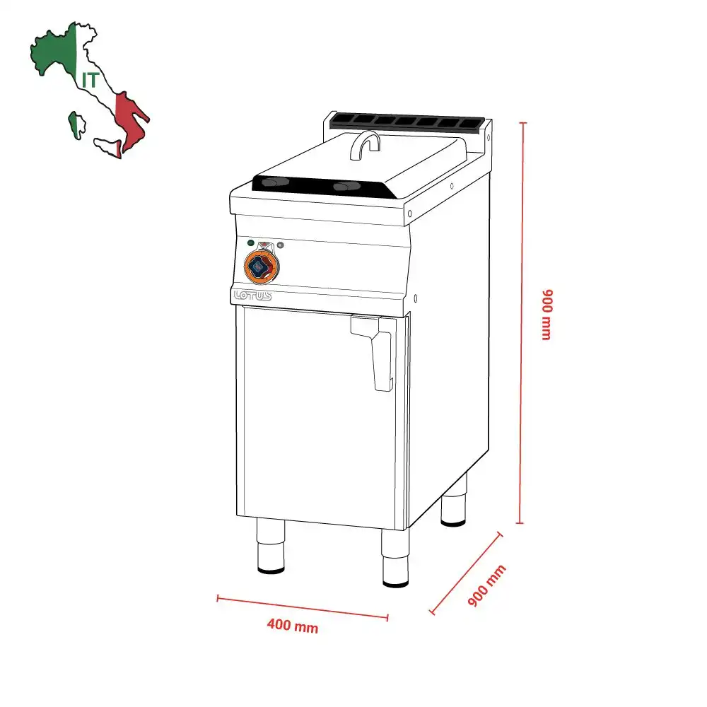 Φριτέζα αερίου επιδαπέδια , χωρητικότητας 18 lt, του εργοστασίου Lotus Ιταλίας.Κατασκευασμένο με χρήση ανοξείδωτου χάλυβα ποιότητας (CrNi 18/10 AISI 304) , με διακόπτες αδιάβροχης ποιότητας (IPX5).