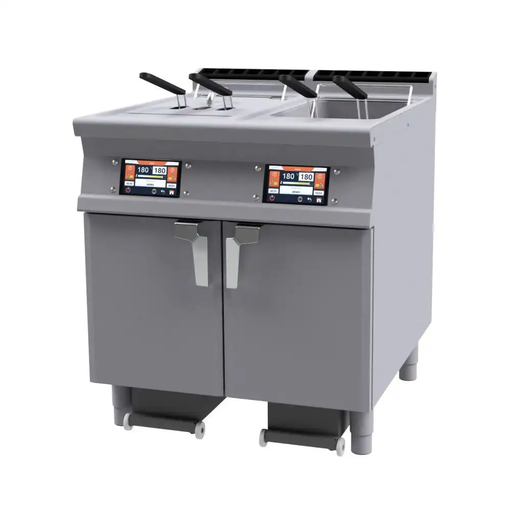Αυτόματη διπλή ηλεκτρική φριτέζα με οθόνη touch 7΄΄ , του εργοστασίου Lotus. Διατήρηση θερμοκρασίας στους 110°C ή προθέρμανση στους 160°C με ή χωρίς λιώσιμο μαγειρικού λίπους (λειτουργία Melting) Δυνατότητα εισαγωγής στην μνήμη έως 100 προγραμμάτων Αισθητήριο πλήρωσης & μέγιστου επιπέδου φόρτωσης λαδιού Αντλία φιλτραρίσματος λαδιού σε θερμοκρασία έως 180°C (αποφεύγουμε τα κενά χρόνου κατά τη διάρκεια της βάρδιας)