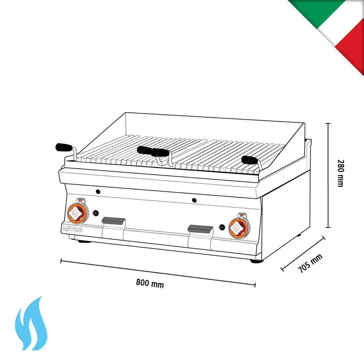 Γκριλιέρα αερίου διπλή , του εργοστασίου Lotus. Κατασκευασμένο με χρήση ανοξείδωτου χάλυβα ποιότητας (CrNi 18/10 AISI 304) , με διακόπτες αδιάβροχης ποιότητας (IPX5).