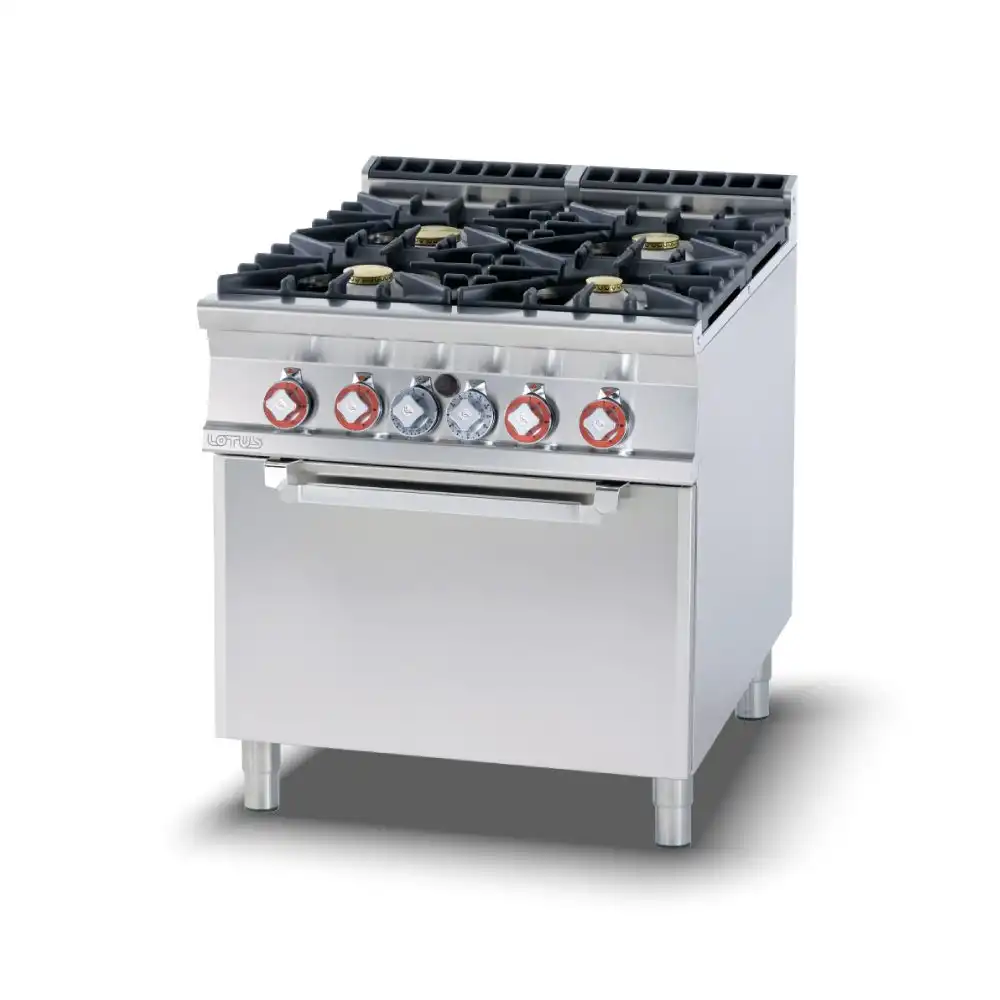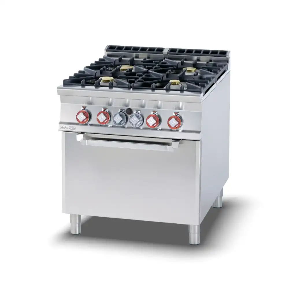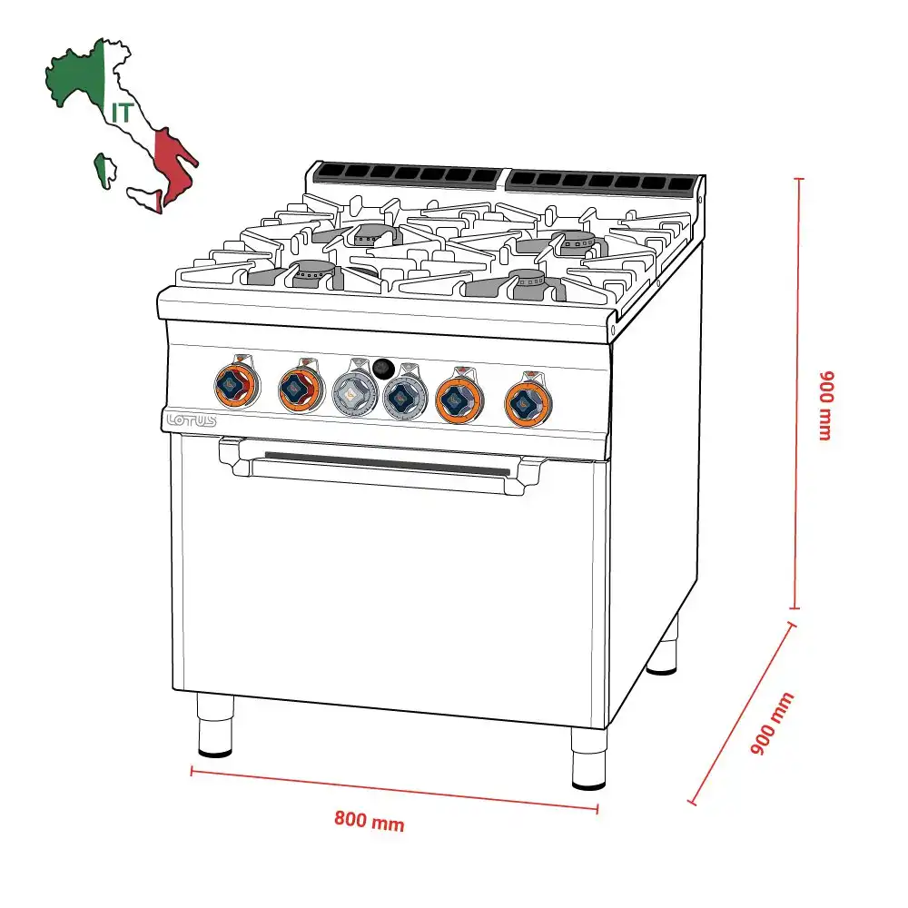 Κουζίνα αερίου 4 εστιών με φούρνο αερίου στατικό , του εργοστασίου Lotus Ιταλίας.Κατασκευασμένο με χρήση ανοξείδωτου χάλυβα ποιότητας (CrNi 18/10 AISI 304) , με διακόπτες αδιάβροχης ποιότητας (IPX5).