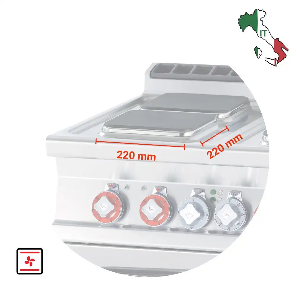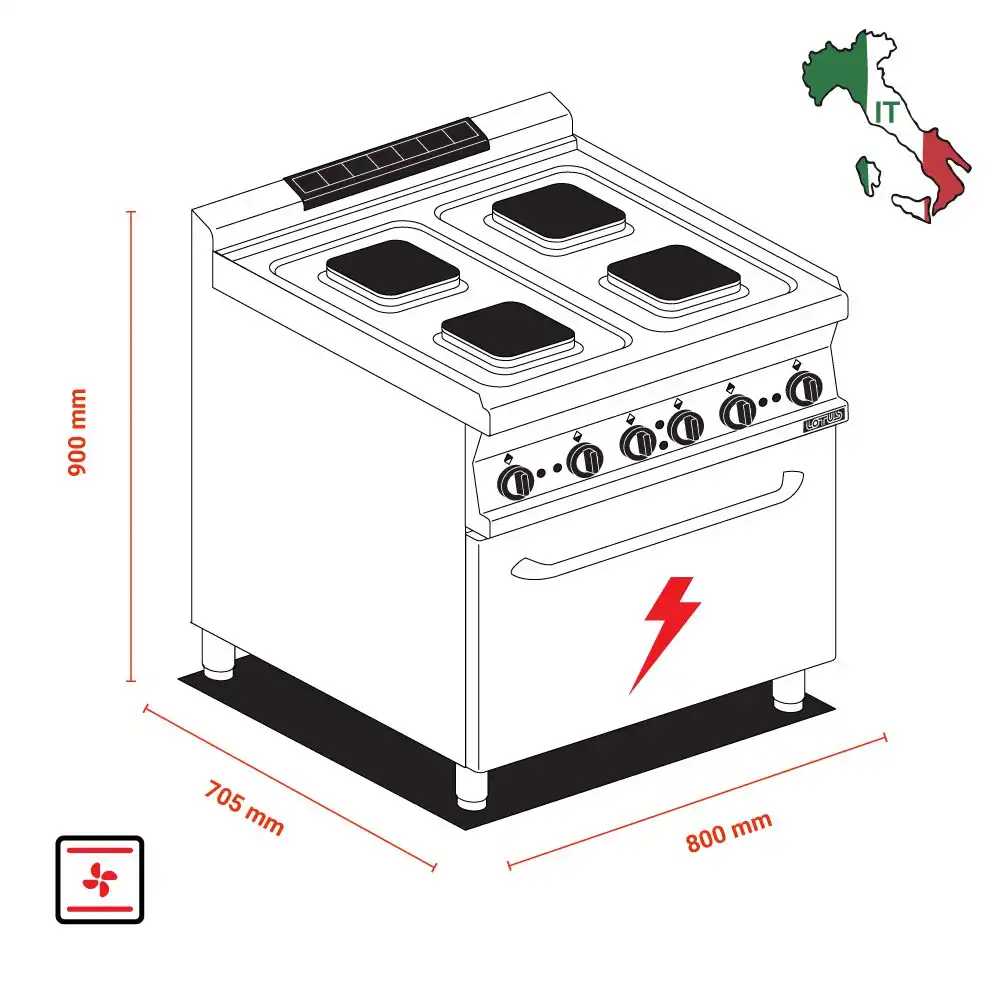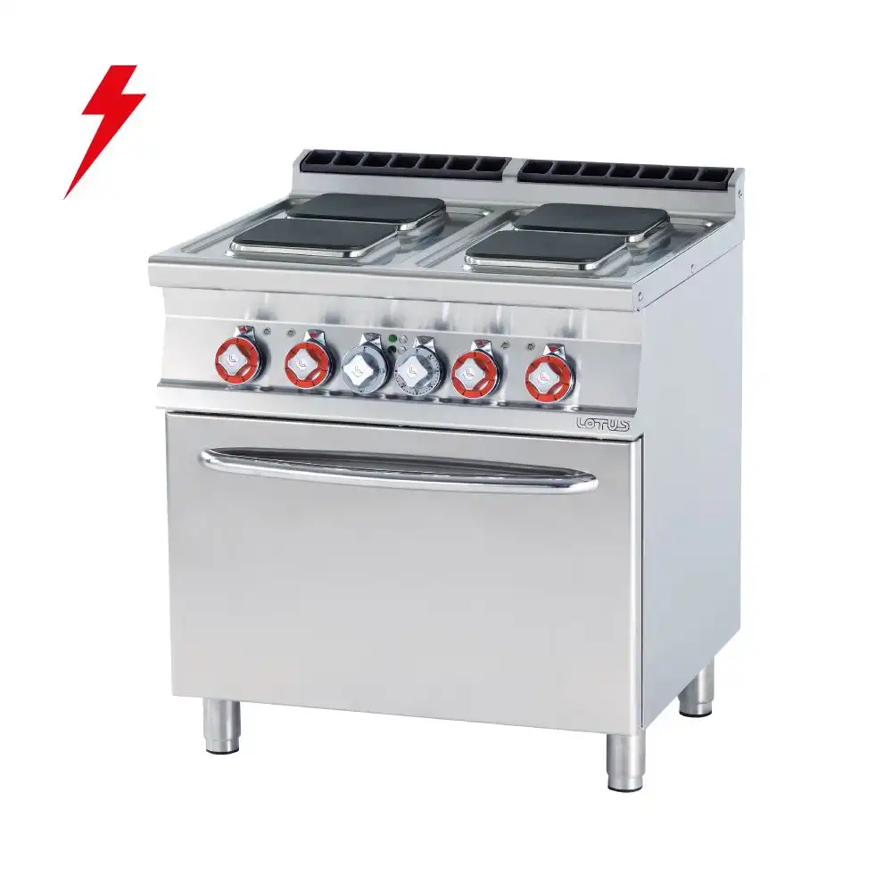 Κουζίνα ηλεκτρική 4 εστιών με φούρνο ηλεκτρικό αερόθερμο (15,72Kwatt) , του εργοστασίου Lotus. Κατασκευασμένο με χρήση ανοξείδωτου χάλυβα ποιότητας (CrNi 18/10 AISI 304) , με διακόπτες αδιάβροχης ποιότητας (IPX5).