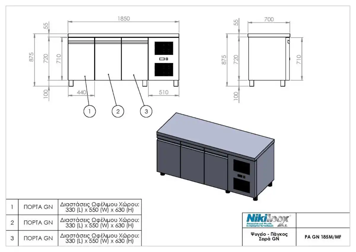 Διαθέτει τρεις πόρτες, που εξασφαλίζουν μεγάλη χωρητικότητα και πρακτικότητα. Η υποδοχή λεκάνης GN 1/1 διευκολύνουν την τακτοποίηση των υλικών σας.