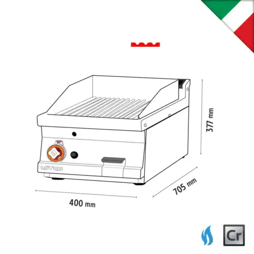 Πλατώ αερίου, διπλό λείο, του εργοστασίου Lotus Ιταλίας. Κατασκευασμένο με χρήση ανοξείδωτου χάλυβα ποιότητας (CrNi 18/10 AISI 304) , με διακόπτες αδιάβροχης ποιότητας (IPX5).
