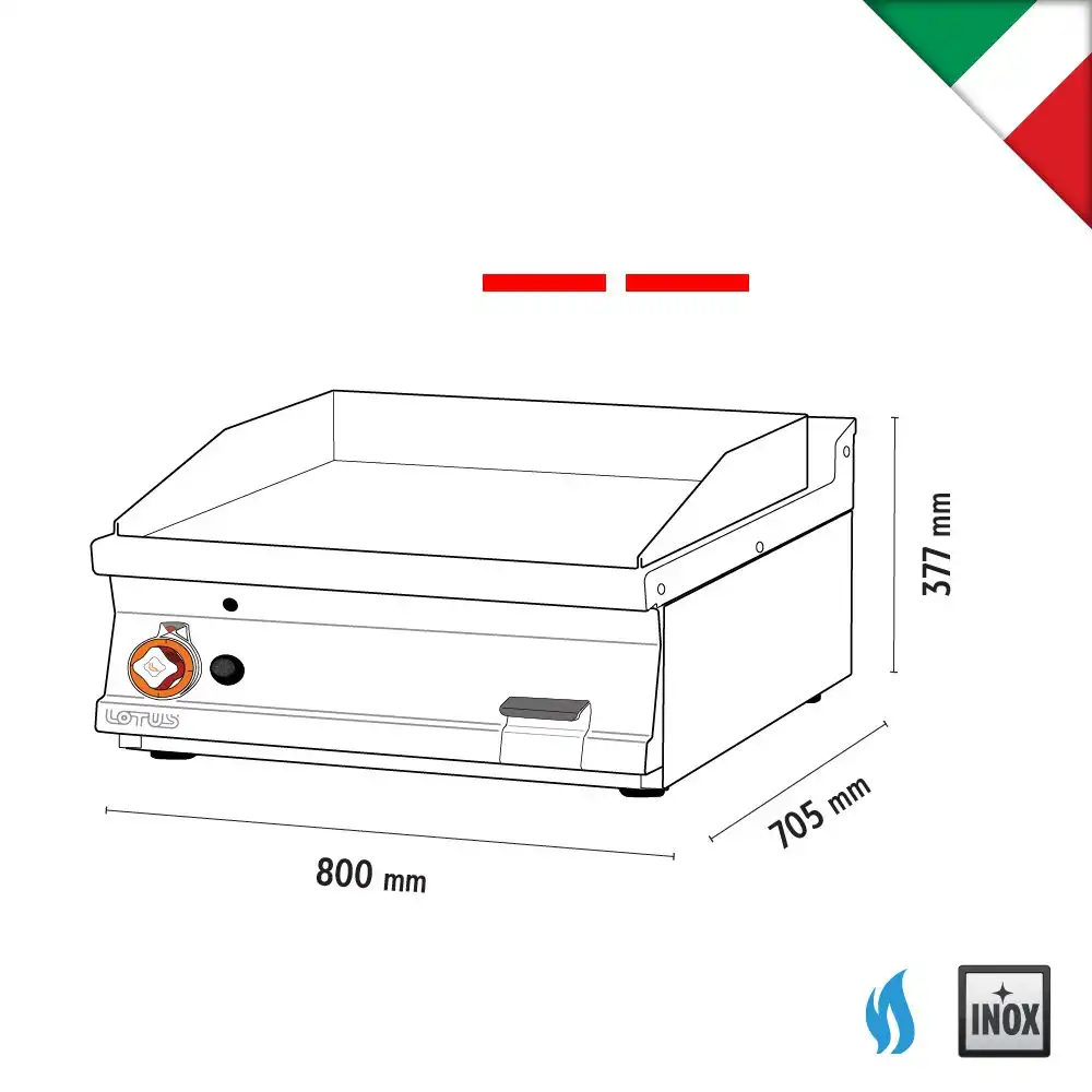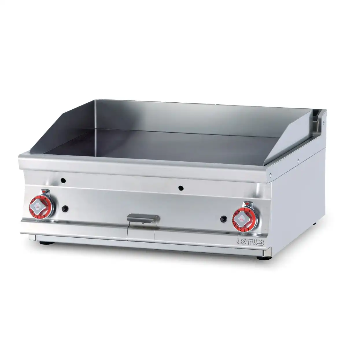 Πλατώ αερίου διπλό λείο, του εργοστασίου Lotus Ιταλίας. Κατασκευασμένο με χρήση ανοξείδωτου χάλυβα ποιότητας (CrNi 18/10 AISI 304) , με διακόπτες αδιάβροχης ποιότητας (IPX5).