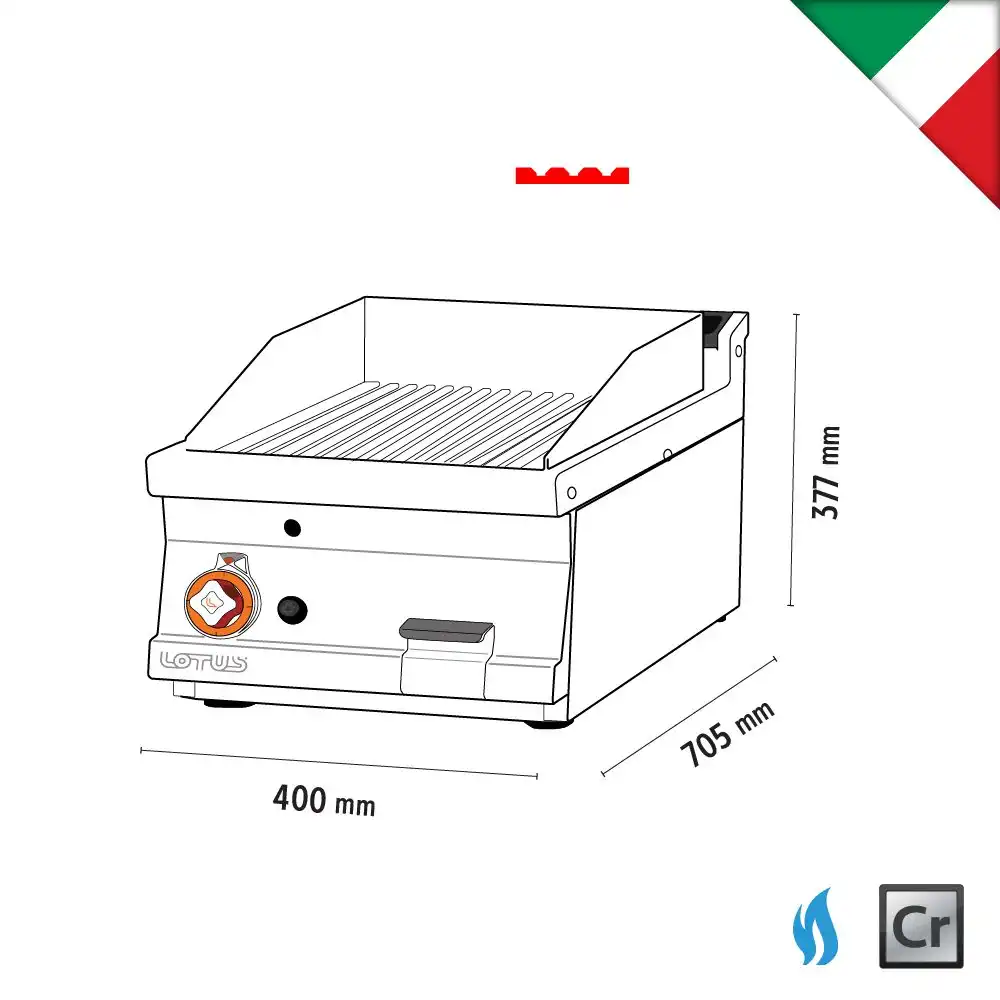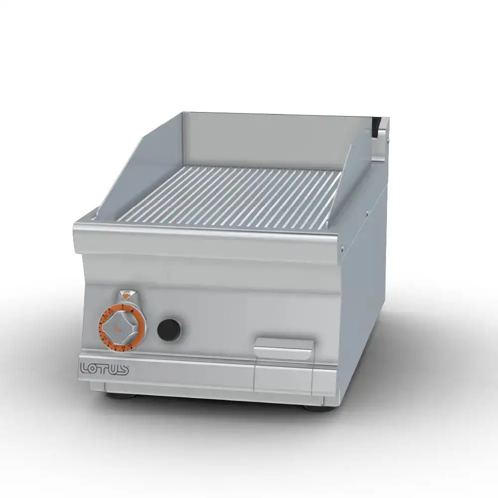 Πλατώ αερίου μονό ραβδωτό χρωμίου , του εργοστασίου Lotus Ιταλίας. Κατασκευασμένο με χρήση ανοξείδωτου χάλυβα ποιότητας (CrNi 18/10 AISI 304) , με διακόπτες αδιάβροχης ποιότητας (IPX5).