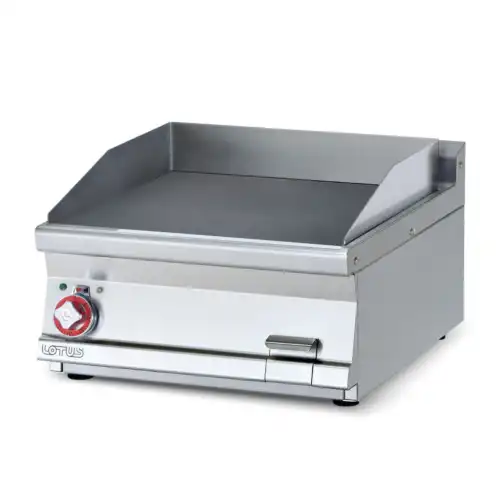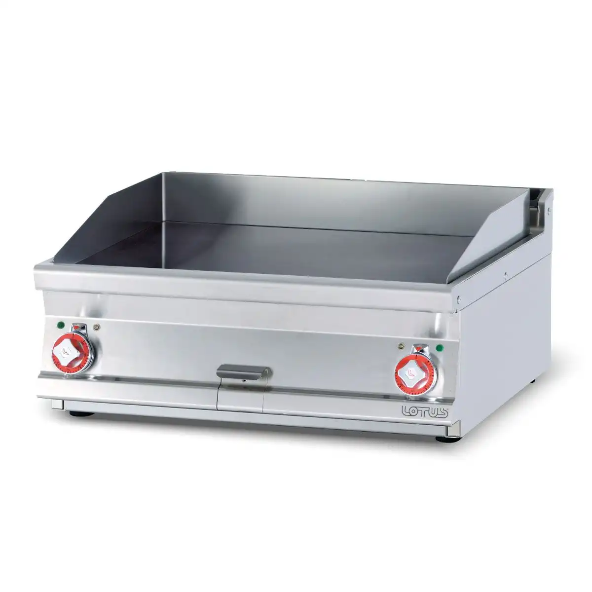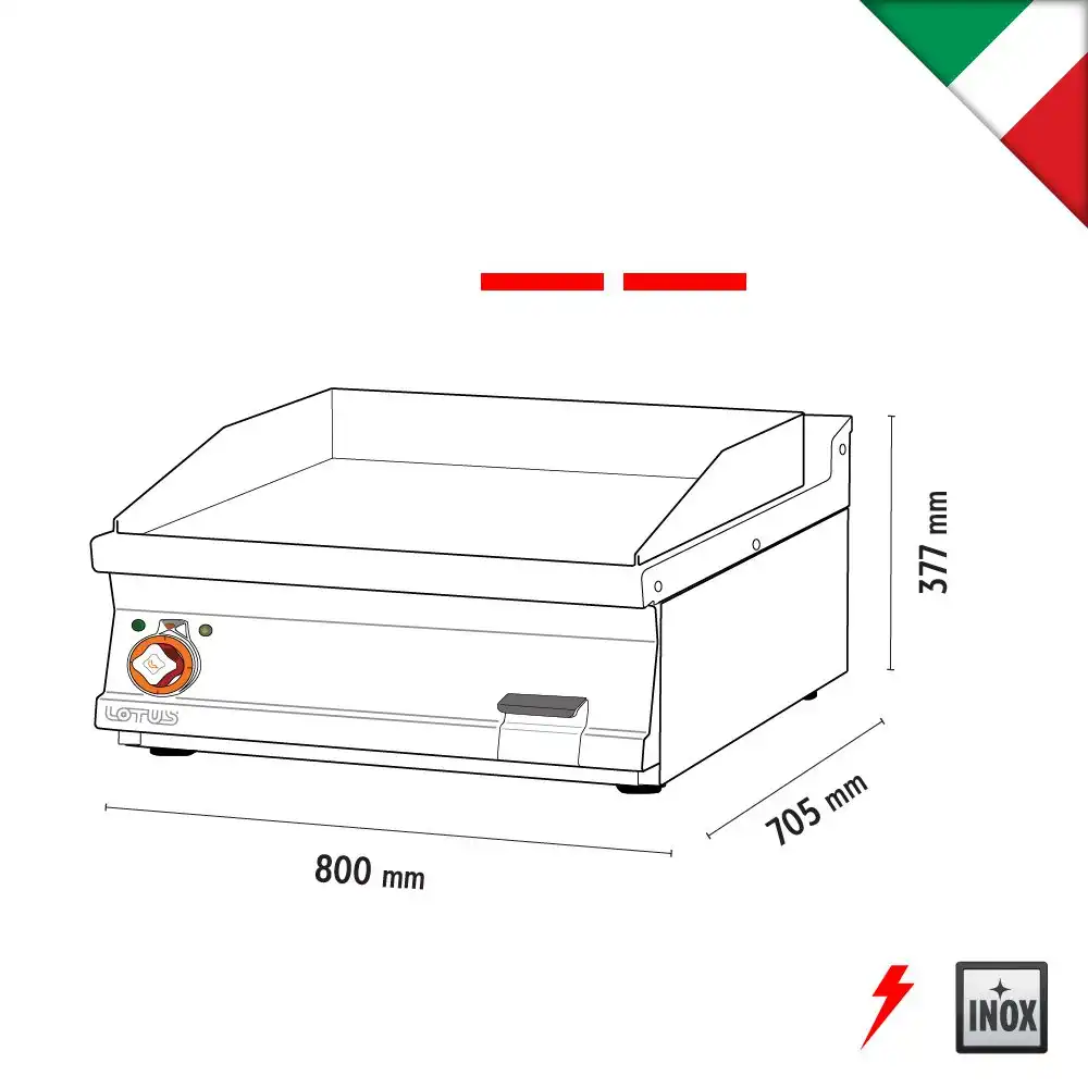 Πλατώ ηλεκτρικό διπλό λείο, του εργοστασίου Lotus Ιταλίας. Κατασκευασμένο με χρήση ανοξείδωτου χάλυβα ποιότητας (CrNi 18/10 AISI 304) , με διακόπτες αδιάβροχης ποιότητας (IPX5).