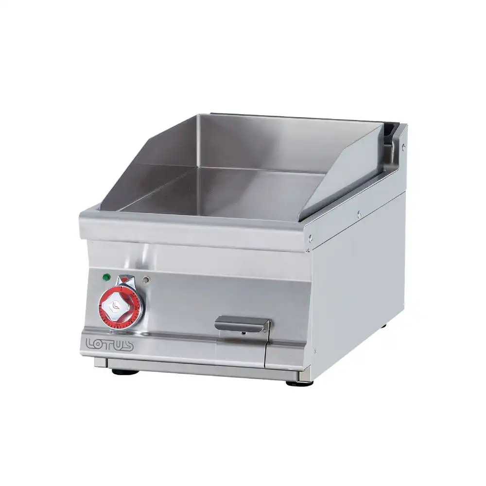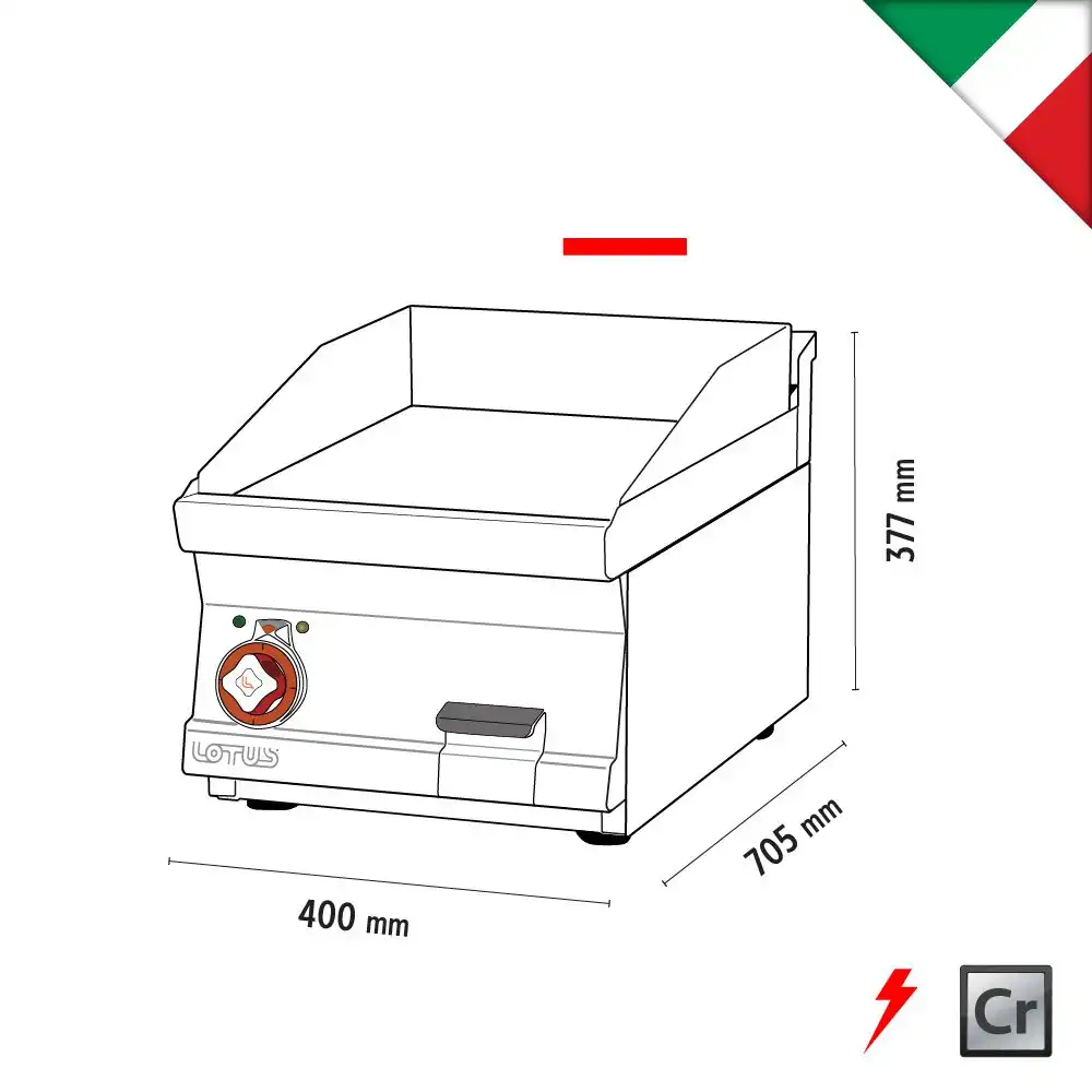 Πλατώ ηλεκτρικό μονό λείο χρωμίου , του εργοστασίου Lotus Ιταλίας. Κατασκευασμένο με χρήση ανοξείδωτου χάλυβα ποιότητας (CrNi 18/10 AISI 304) , με διακόπτες αδιάβροχης ποιότητας (IPX5).