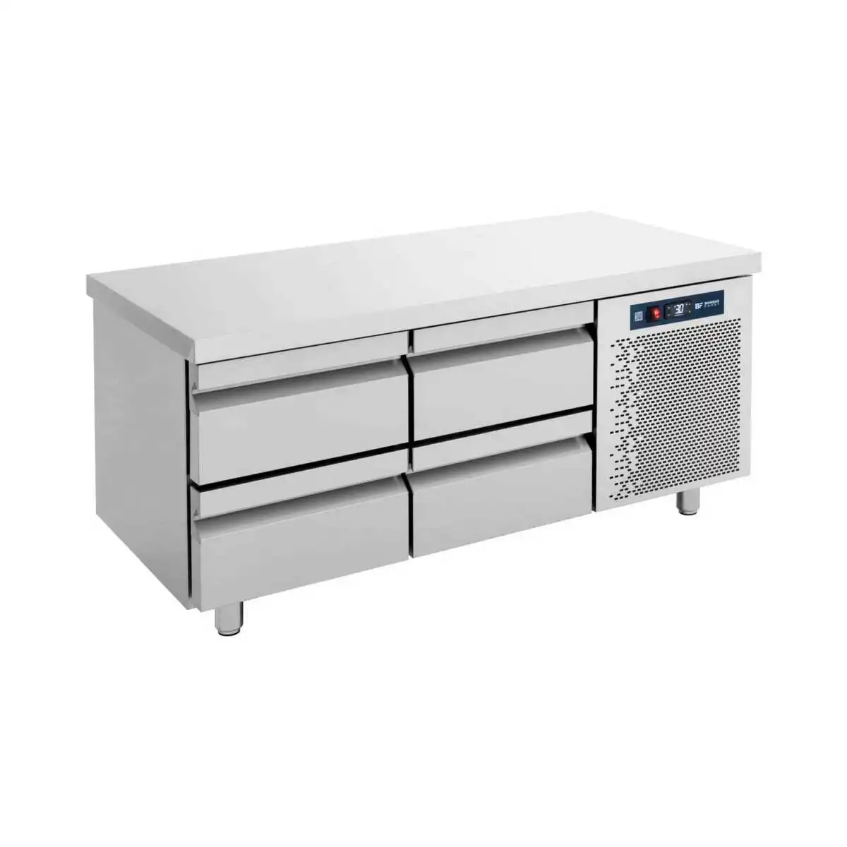 Κατασκευασμένο από ανοξείδωτο χάλυβα Μόνωση με οικολογική πολυουρεθάνη πάχους 5 cm Στοιχείο βαμμένο με αντιδιαβρωτική προστασία Πάτος με υγειονομικές γωνίες Πόδια ανοξείδωτα ρυθμιζόμενα Συρτάρια GN Φρέον οικολογικό