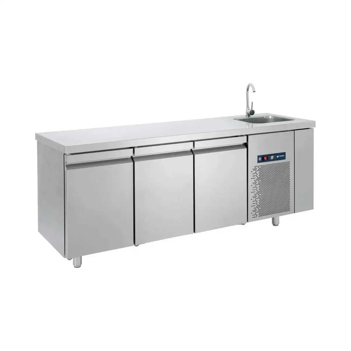 Κατασκευασμένο από ανοξείδωτο χάλυβα AISI 304 18/8-10 Μόνωση με οικολογική πολυουρεθάνη πάχους 5 cm Στοιχείο και condenser με αντιδιαβρωτική προστασία Πάτος με υγειονομικές γωνίες Πόρτες με αυτόματη επαναφορά κάτω από 90° Πόδια ανοξείδωτα ρυθμιζόμενα Σχάρες πλαστικοποιημένες ρυθμιζόμενες καθ’ ύψος Δυνατότητα τοποθέτησης λεκάνης GN κάτω από τη σχάρα στον ίδιο οδηγό για εξοικονόμηση χώρου Οδηγούς inox για GN Οικολογικό ψυκτικό υγρό R290