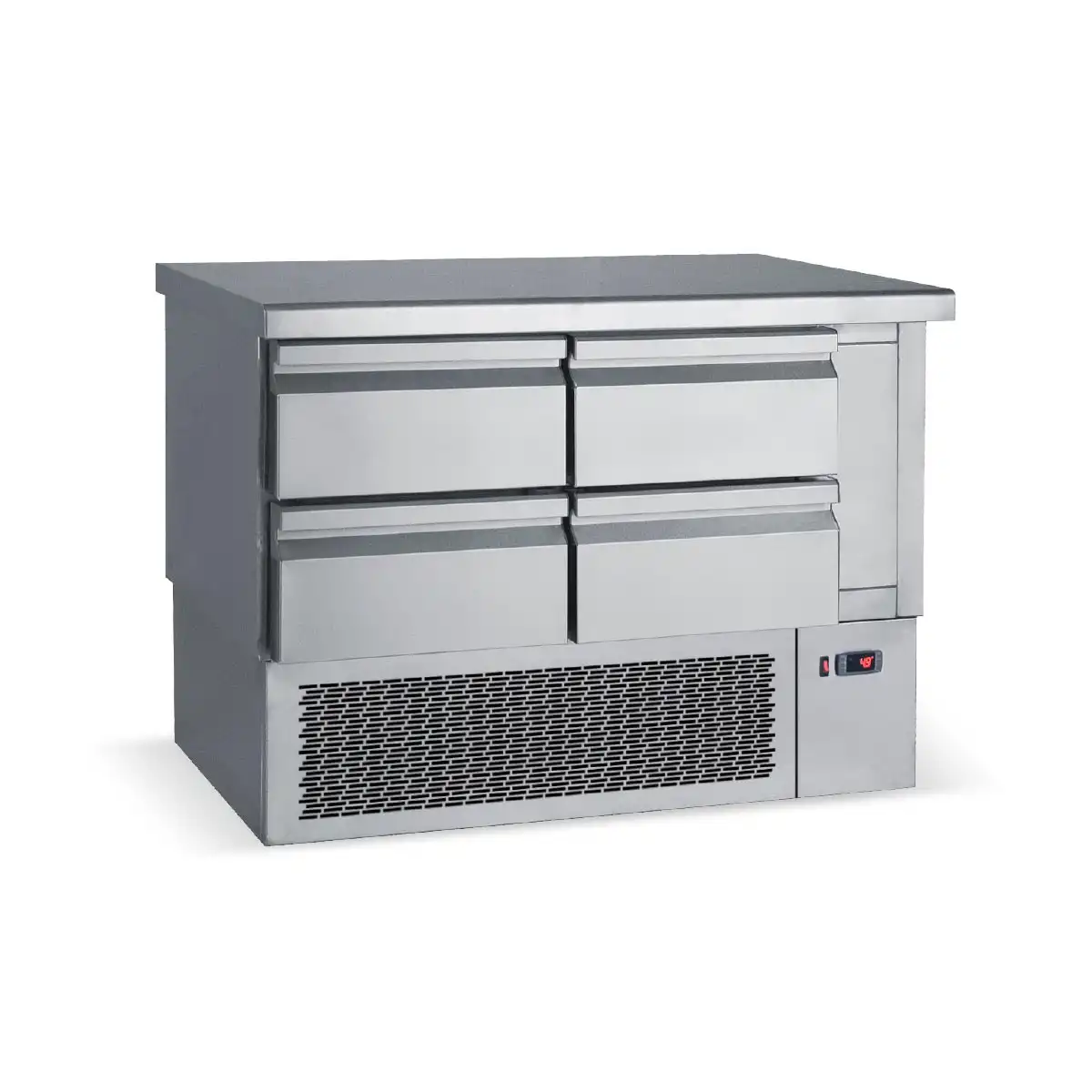 Κατασκευασμένο από ανοξείδωτο χάλυβα Μόνωση με οικολογική πολυουρεθάνη πάχους 5 cm Πάτος με υγειονομικές γωνίες Πόδια ρυθμιζόμενα 4 συρτάρια GN Φρέον οικολογικό