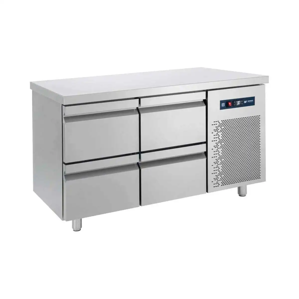 Κατασκευασμένο από ανοξείδωτο χάλυβα Μόνωση με οικολογική πολυουρεθάνη πάχους 5 cm Στοιχείο βαμμένο με αντιδιαβρωτική προστασία Συρτάρια GN Πάτος με υγειονομικές γωνίες Πόδια ανοξείδωτα ρυθμιζόμενα Φρέον οικολογικό