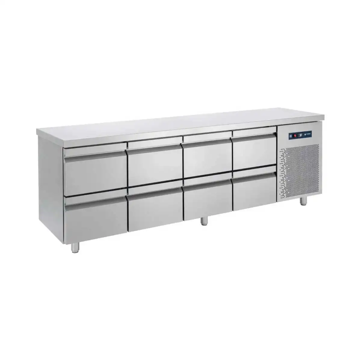 Κατασκευασμένο από ανοξείδωτο χάλυβα Μόνωση με οικολογική πολυουρεθάνη πάχους 5 cm Στοιχείο βαμμένο με αντιδιαβρωτική προστασία Συρτάρια GN Πάτος με υγειονομικές γωνίες Πόδια ανοξείδωτα ρυθμιζόμενα Φρέον οικολογικό