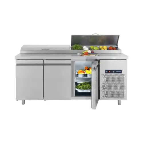 Κατασκευασμένο από ανοξείδωτο χάλυβα Μόνωση με οικολογική πολυουρεθάνη πάχους 5 cm Πάτος με υγειονομικές γωνίες Πόρτες με αυτόματη επαναφορά κάτω από 90° Πόδια ανοξείδωτα ρυθμιζόμενα Σχάρες πλαστικοποιημένες ρυθμιζόμενες καθ’ ύψος Γυάλινο ράφι Βιτρίνα για τοποθέτηση λεκανών GN Φρέον οικολογικό