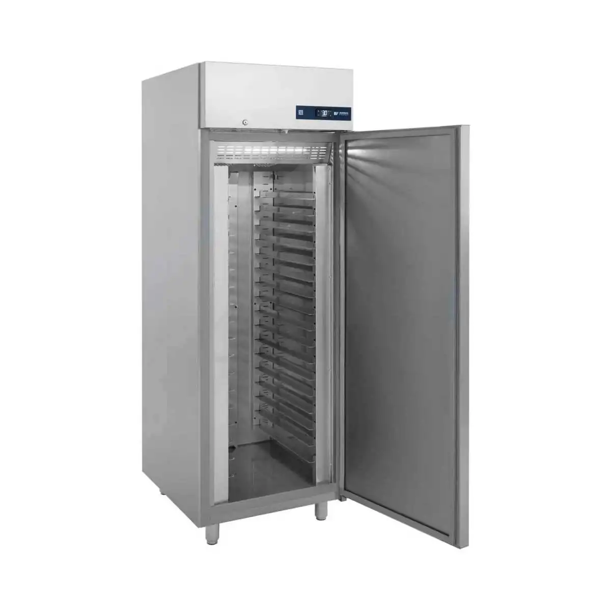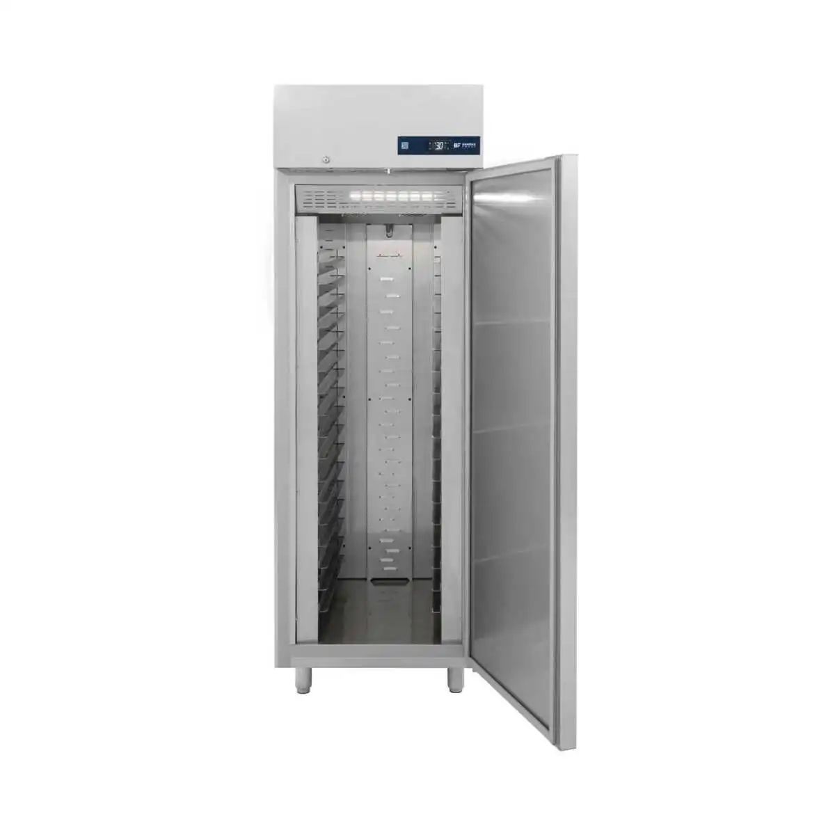 Κατασκευασμένο εσωτερικά και εξωτερικά από ανοξείδωτο χάλυβα AISI 304 18/10 Μόνωση με οικολογική πολυουρεθάνη πάχους 7 cm στο σώμα και 8 cm στο πάτο Πάτος με υγειονομικές γωνίες Εσωτερικά ανοξείδωτη κατασκευή με υποδοχές για 17 λαμαρίνες 40×60 Πόδια ανοξείδωτα ρυθμιζόμενα Τερματικός διακόπτης που σταματάει την λειτουργία του στοιχείου με το άνοιγμα της πόρτας Οικολογικό ψυκτικό υγρό R290 Στοιχείο και condenser με αντιδιαβρωτική προστασία Αγωγός αέρα για ομοιόμορφη κατανομή της ψύξης