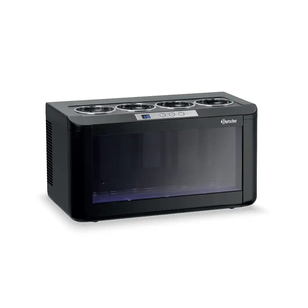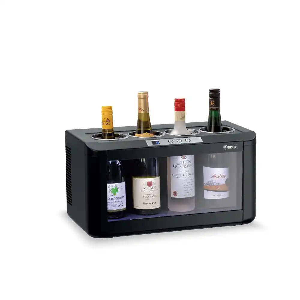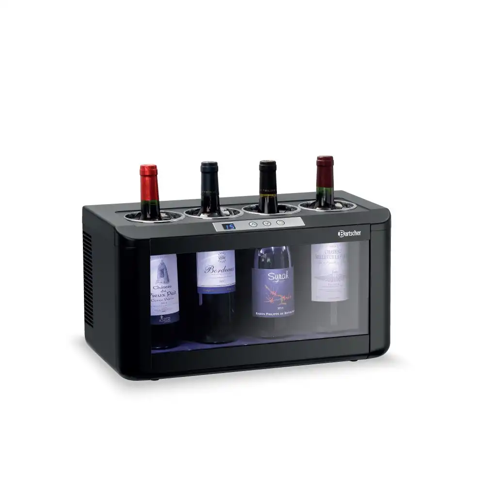 Συντηρητής κρασιών για 4 φιάλες (4FL-100) , Bartscher Γερμανίας. Ο συντηρητής κρασιών 4FL-100 της Bartscher αποτελεί την ιδανική λύση για την διατήρηση λευκού ροζέ ή κόκκινου κρασιού στην θερμοκρασία που επιθυμείτε. Χάρη στις μικρές του διαστάσεις και τον LED φωτισμό του σας βοηθά να παρουσιάσετε με τον καλύτερο δυνατό τρόπο τα κρασιά σας πάνω στο μπουφέ , στο μπάρ ή κατά την δοκιμή κρασιού.