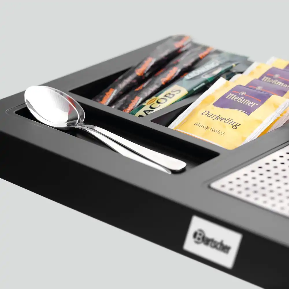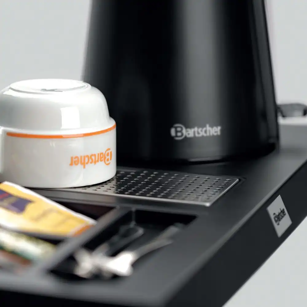 Tea Station για 1 κανάτα , μαύρο ματ , Bartscher Γερμανίας. Καυτό νερό για τσάι, στιγμιαίο καφέ ή άλλα ροφήματα: Είτε στο δωμάτιο ξενοδοχείου, σε αίθουσες αναμονής ή στην εξυπηρέτηση πελατών. Με αυτό το tea station της Bartscher , όλα είναι τακτοποιημένα και άμεσα διαθέσιμα – Από το φακελάκι τσαγιού μέχρι το κουτάλι.
