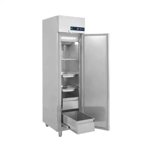 Κατασκευασμένο εσωτερικά και εξωτερικά από ανοξείδωτο χάλυβα Μόνωση με οικολογική πολυουρεθάνη πάχους 7 cm στο σώμα και 8 cm στο πάτο Πάτος με υγειονομικές γωνίες Σχάρες πλαστικοποιημένες ρυθμιζόμενες καθ’ ύψος Οδηγοί Inox για GN λεκανάκια Πόδια ανοξείδωτα ρυθμιζόμενα Τερματικός διακόπτης που σταματάει την λειτουργία του στοιχείου με το άνοιγμα της πόρτας Φρέον οικολογικό Αγωγός αέρα για ομοιόμορφη κατανομή της ψύξης