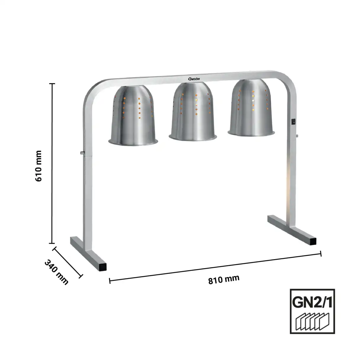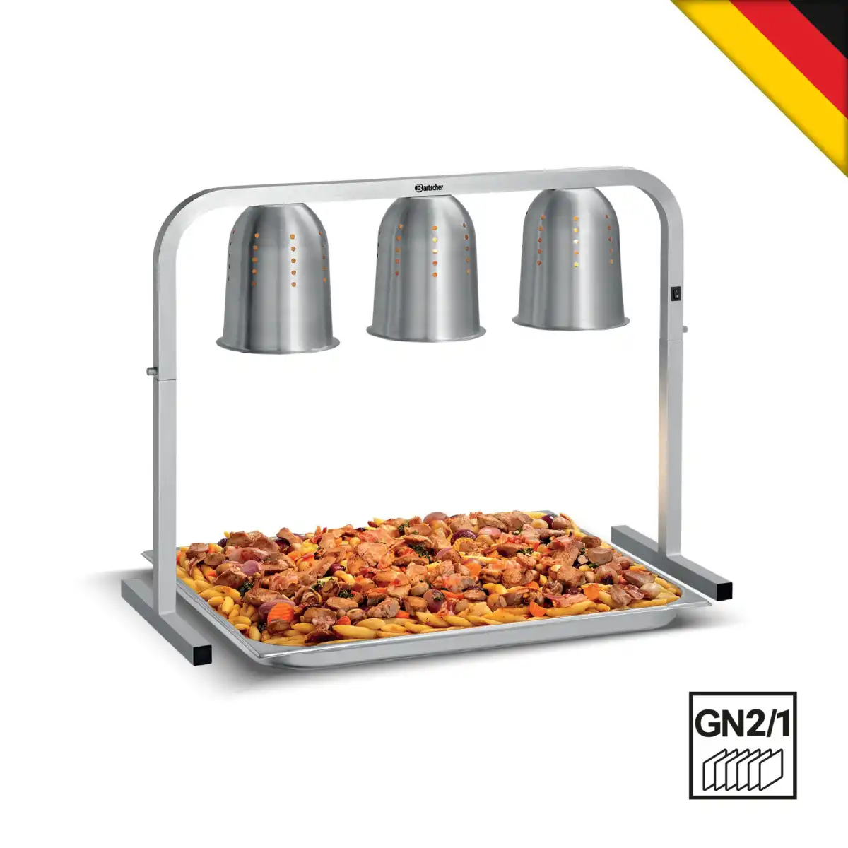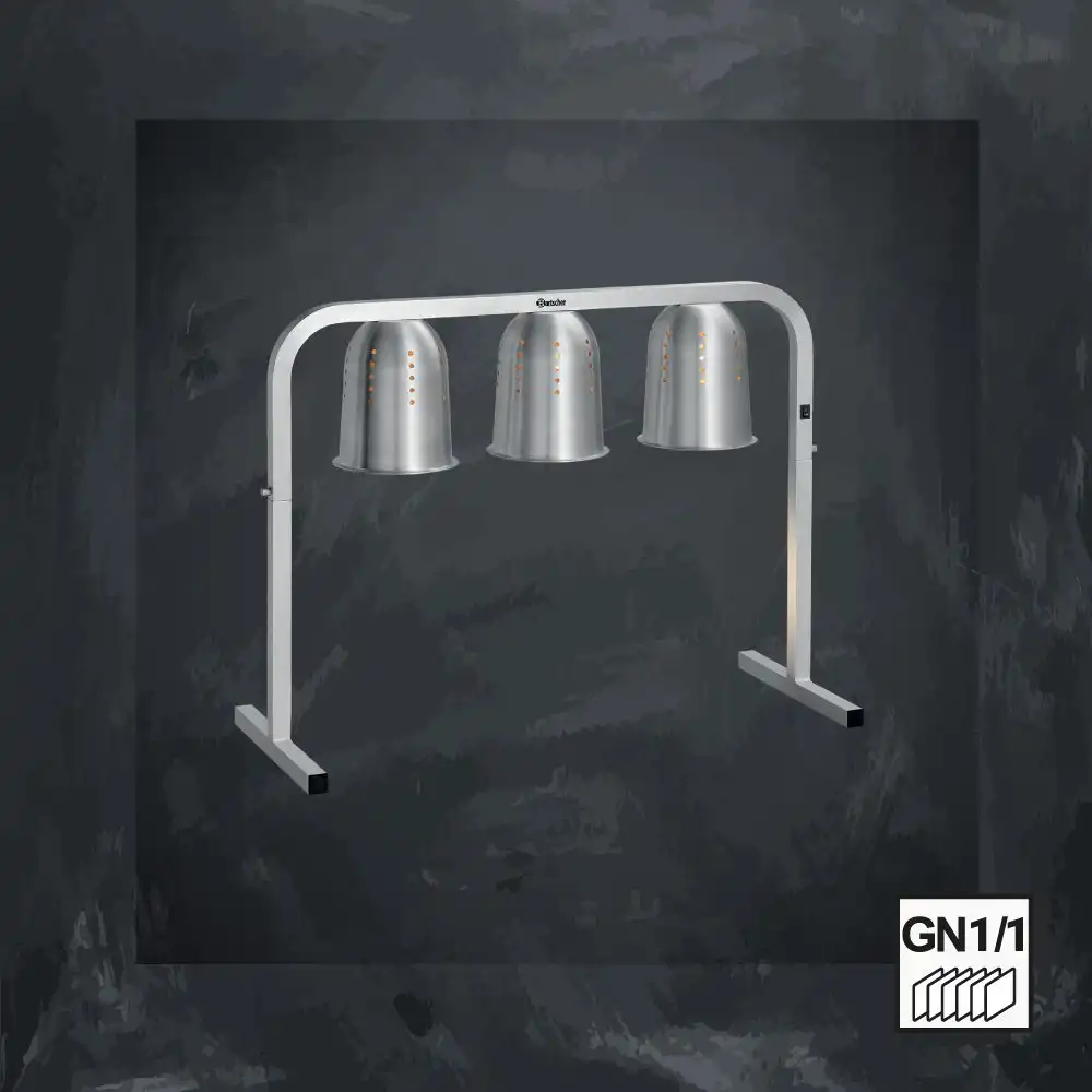 Θερμαντικό με 3 υπέρυθρες θερμικές λάμπες, Bartscher Γερμανίας. 3 θερμαντικές λάμπες με αεριζόμενους ανακλαστήρες αλουμινίου φροντίζουν για στοχευμένη μεταφορά της θερμότητας. Η επιφάνεια τοποθέτησης προσφέρει χώρο για δοχεία έως 2/1 GN και γι’ αυτόν το λόγο είναι ιδανική για μεγάλους μπουφέδες, κέτερινγκ ή καντίνες.
