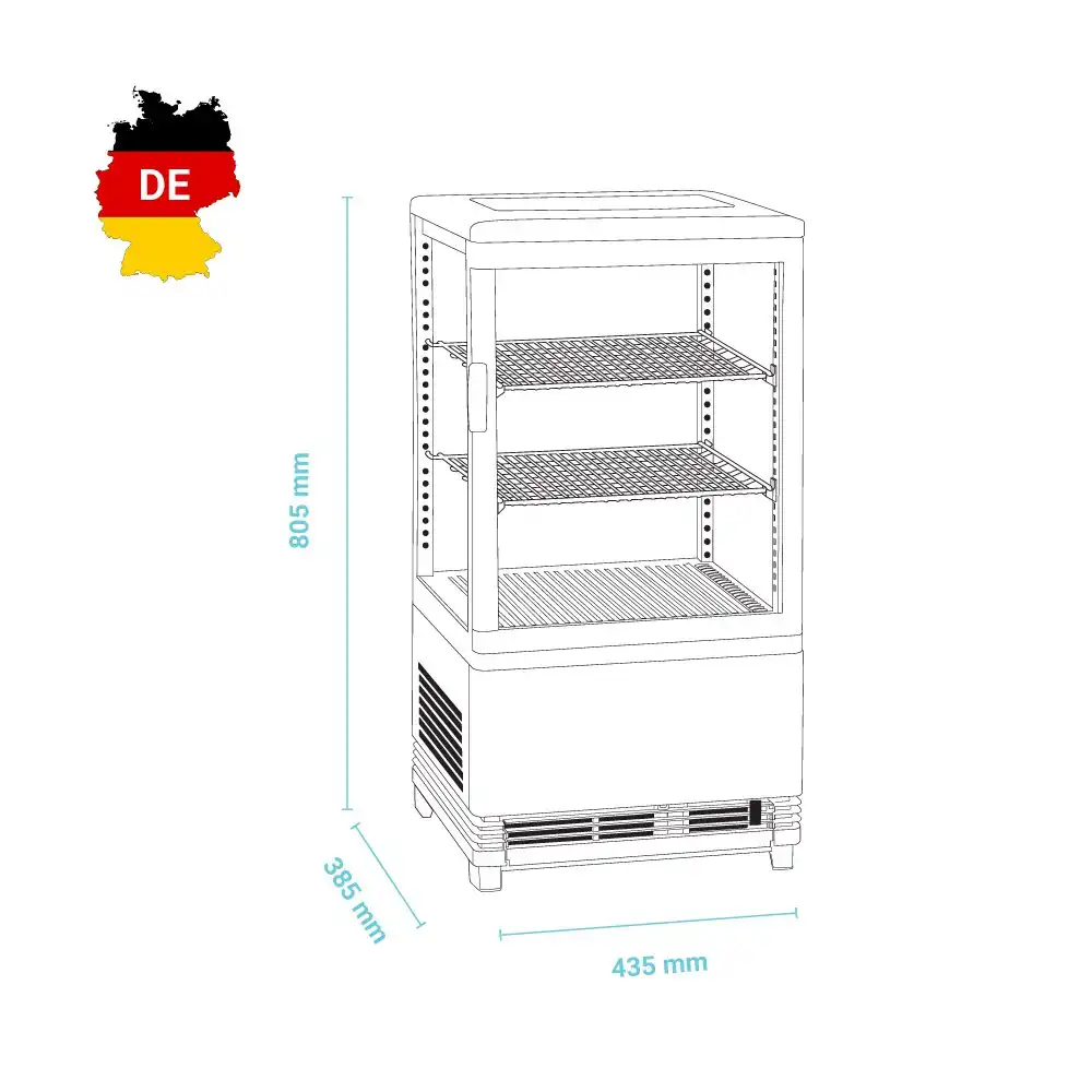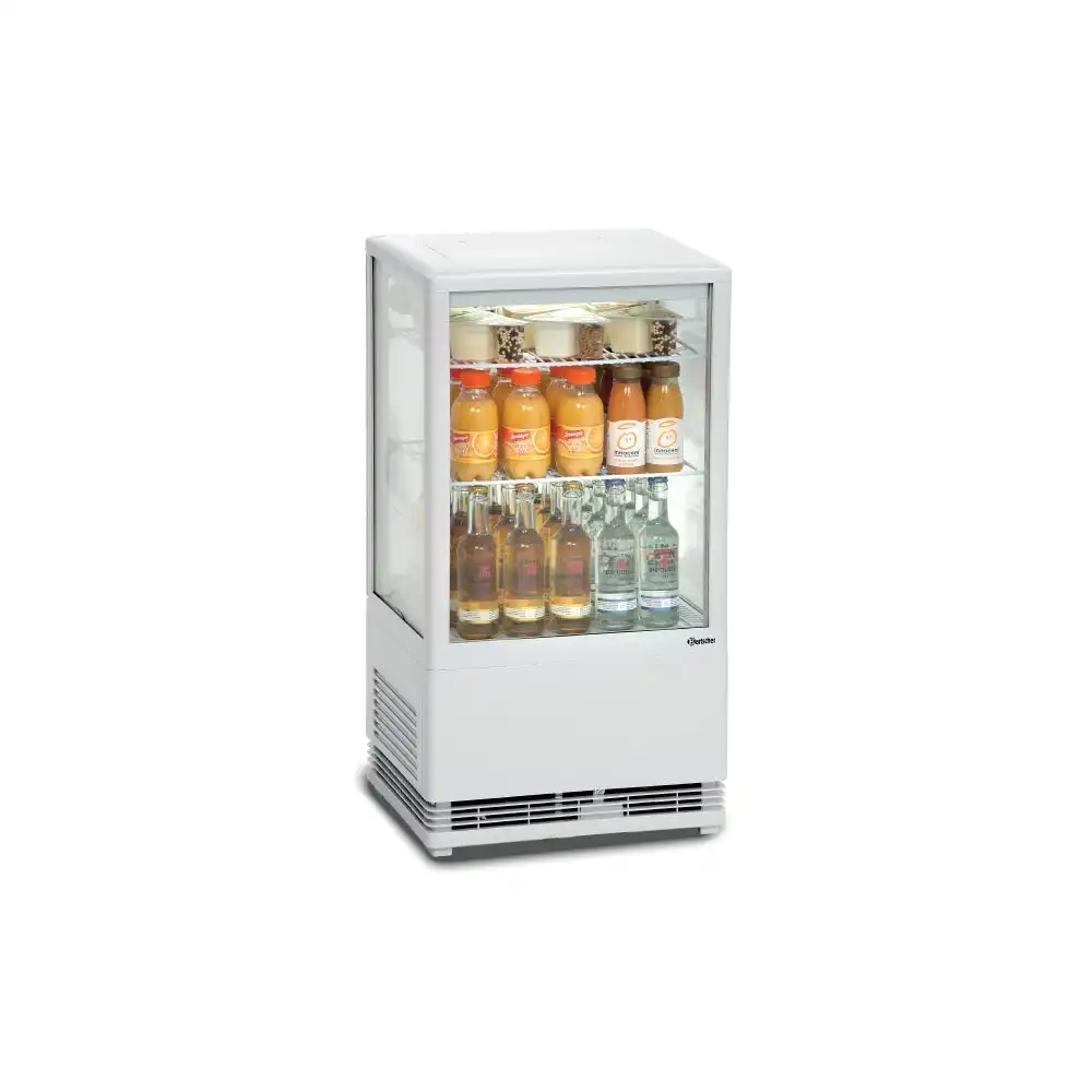 Επιτραπέζια πανοραμική βιτρίνα συντήρησης , χωρητικότητας 58 lt. Προμηθευτής : Bartscher Η συμπαγής ψυχόμενη βιτρίνα σε λευκή έκδοση με χωρητικότητα 58 λίτρα θα σας πείσει με το φιλικό προς το περιβάλλον ψυκτικό μέσο και την ισχυρή έκδοση με μεγάλη διάρκεια ζωής.
