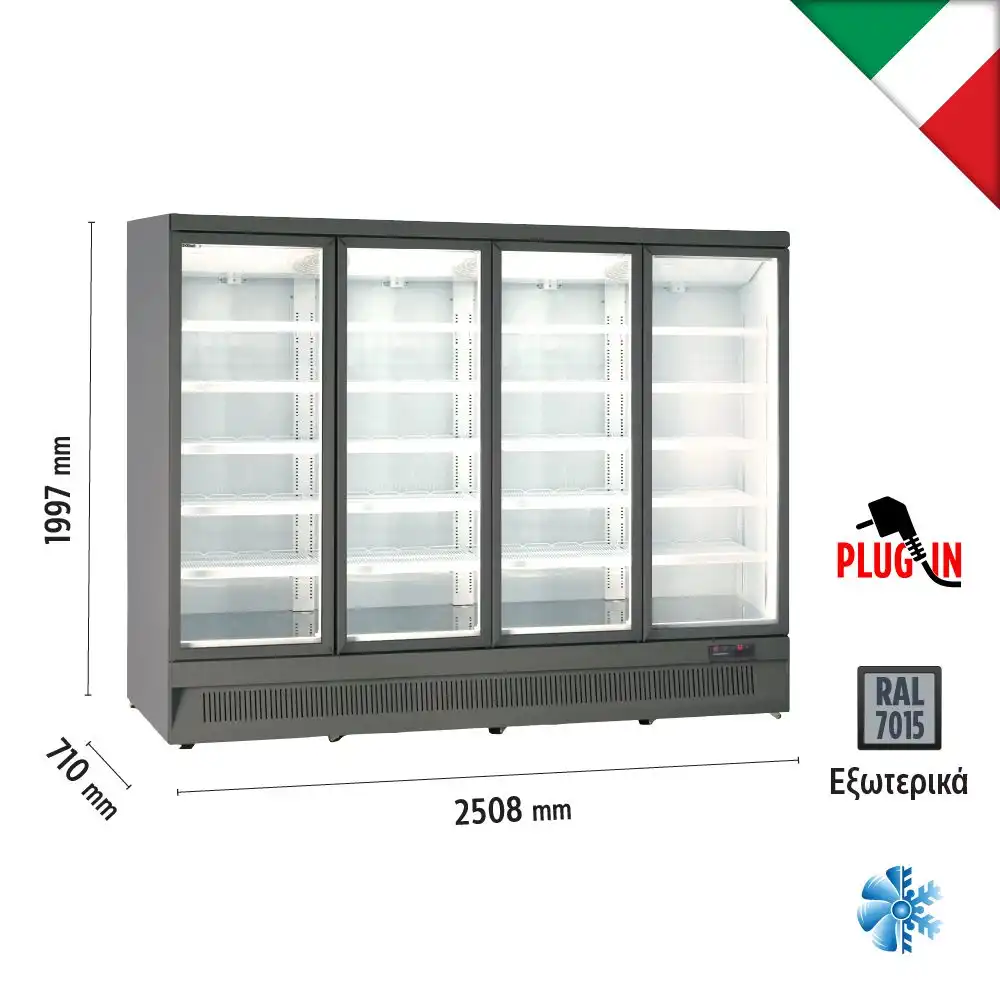 Βιτρίνα συντήρησης όρθια τετραπλή , χρώματος grey (RAL7015) , βεβιασμένης ψύξης , με 4 ανοιγόμενες πόρτες , χωρητικότητας 2060 lt. Προμηθευτής : KlimaItalia