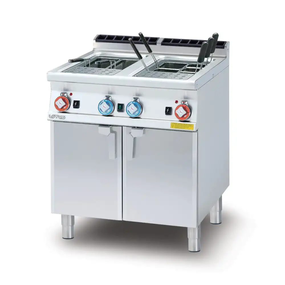 Επιδαπέδιος βραστήρας ζυμαρικών αερίου , χωρητικότητας 25+25 lt, του εργοστασίου Lotus Ιταλίας. Κατασκευασμένο με χρήση ανοξείδωτου χάλυβα ποιότητας (CrNi 18/10 AISI 304) , με διακόπτες αδιάβροχης ποιότητας (IPX5).